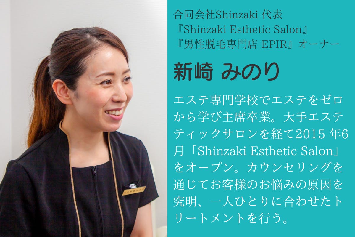 大阪梅田にて、心地よさ溢れるフェイシャルトリートメントサロン「Shinzaki Esthetic Salon」と、「男性脱毛専門店 EPIR(エピル)」を運営しています。毎日、お客様の笑顔と自信に溢れた姿を見ることが、私の一番の喜びです。