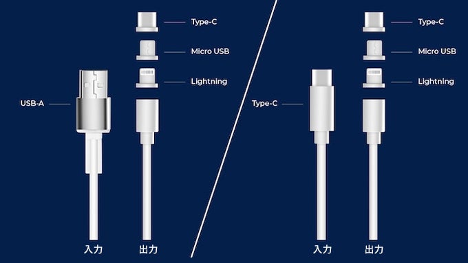 入力タイプはUSB-A/Type-Cの2種類からお選びいただけます。出力用にはlighting、Type-C、Micro USBの3つのアダプターが装備されます。