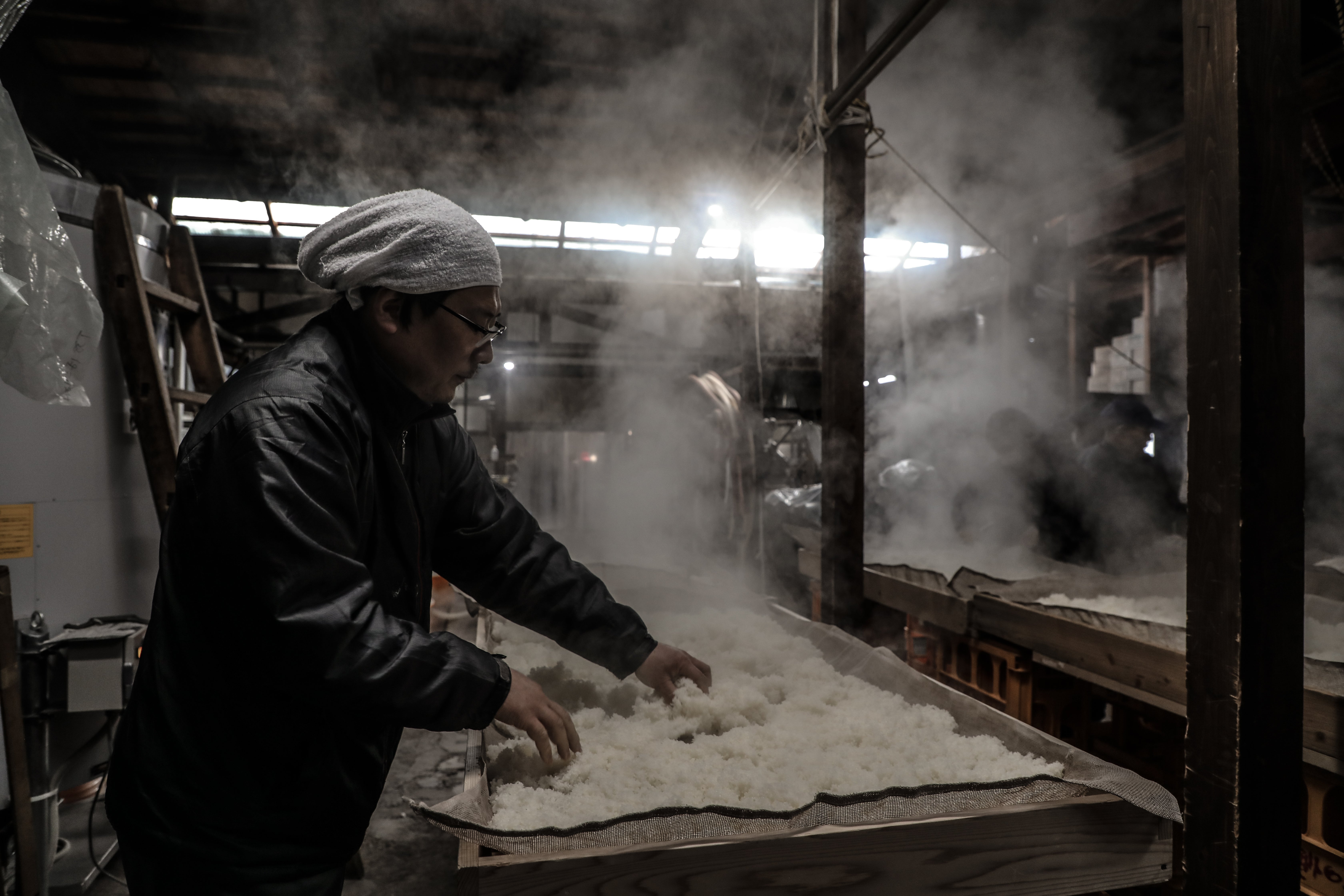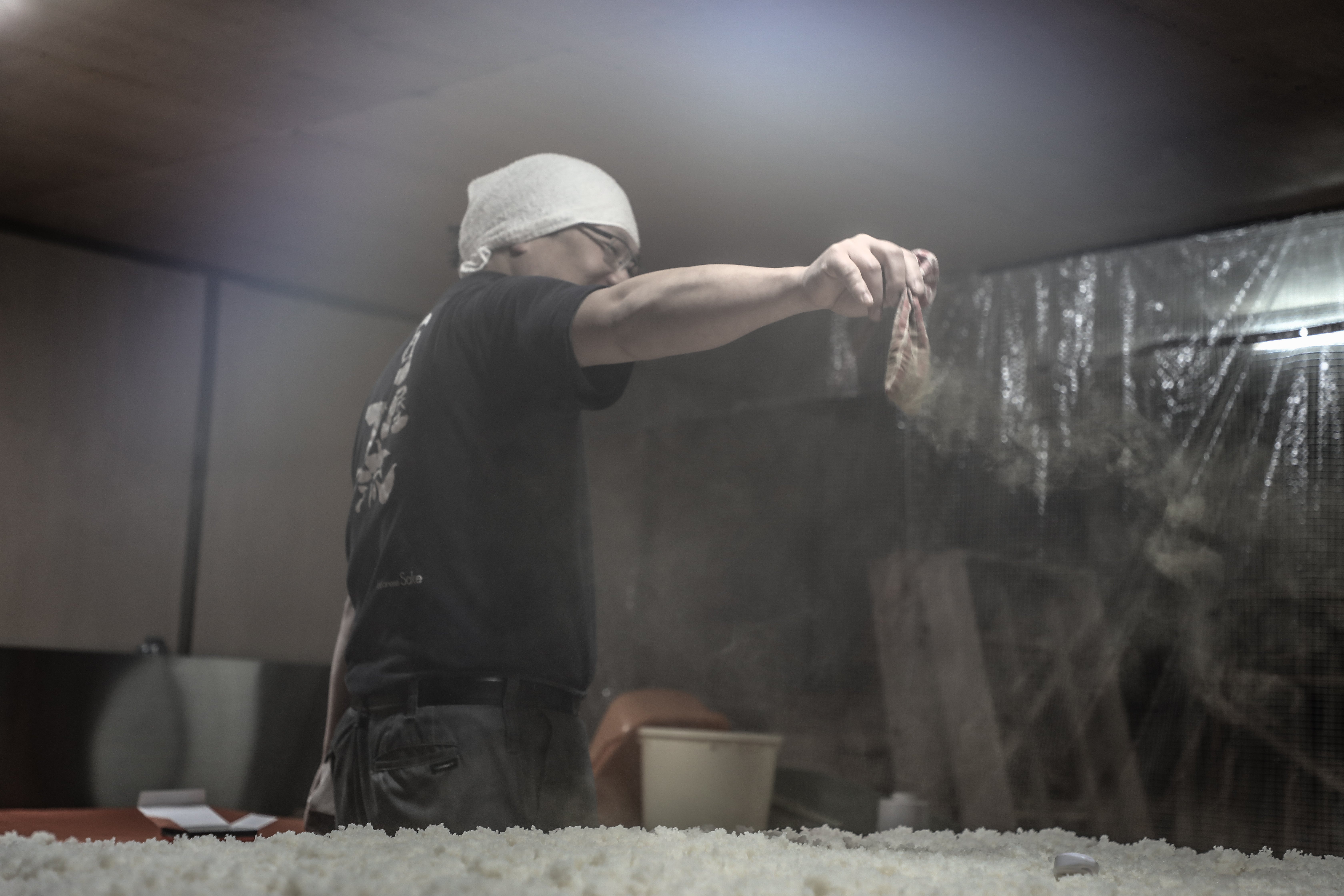 蒸し上がった米から上がる蒸気が充満する酒造場