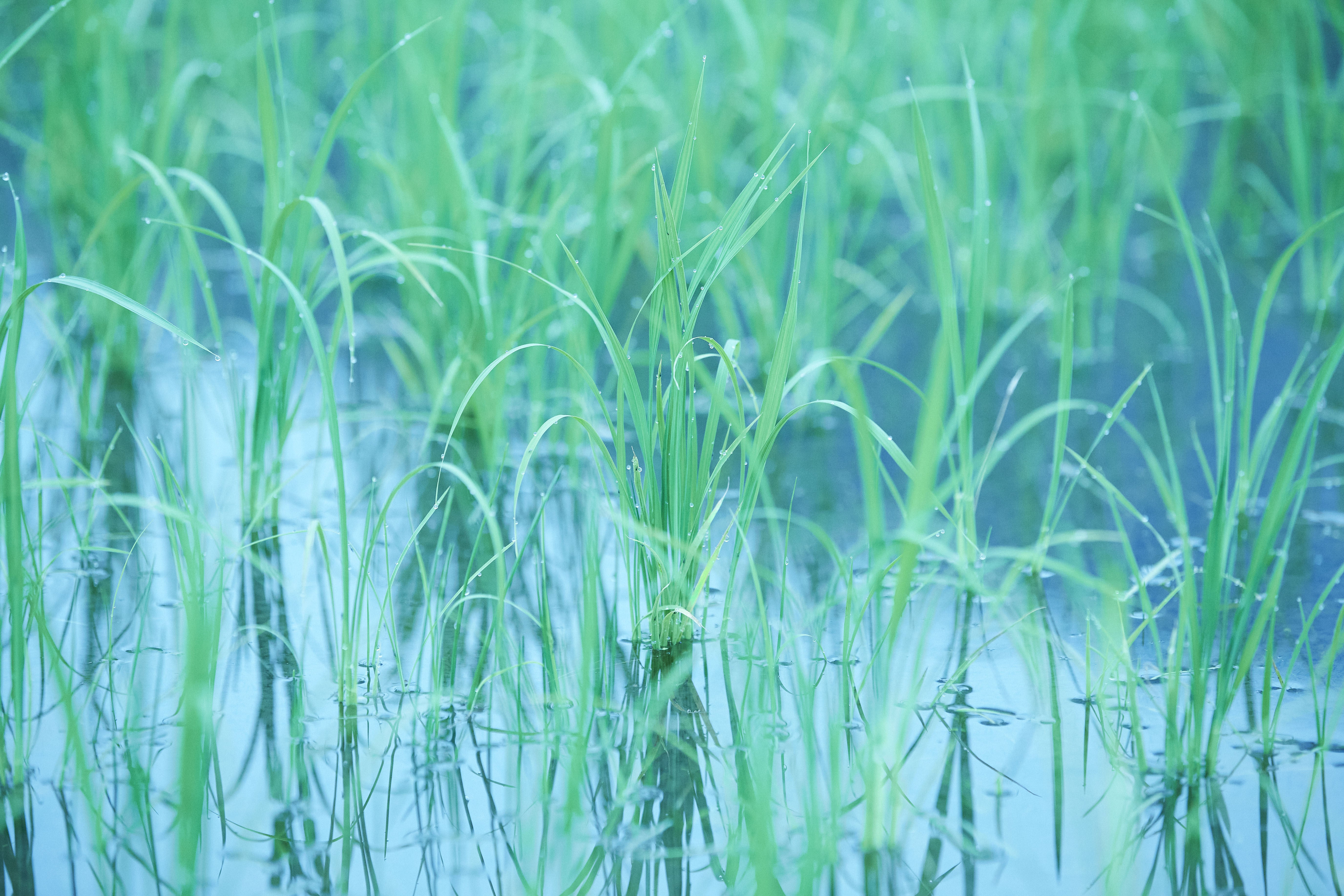 田植えを終えたばかりの水田、化学肥料や農薬を使わずに育てるコシヒカリ