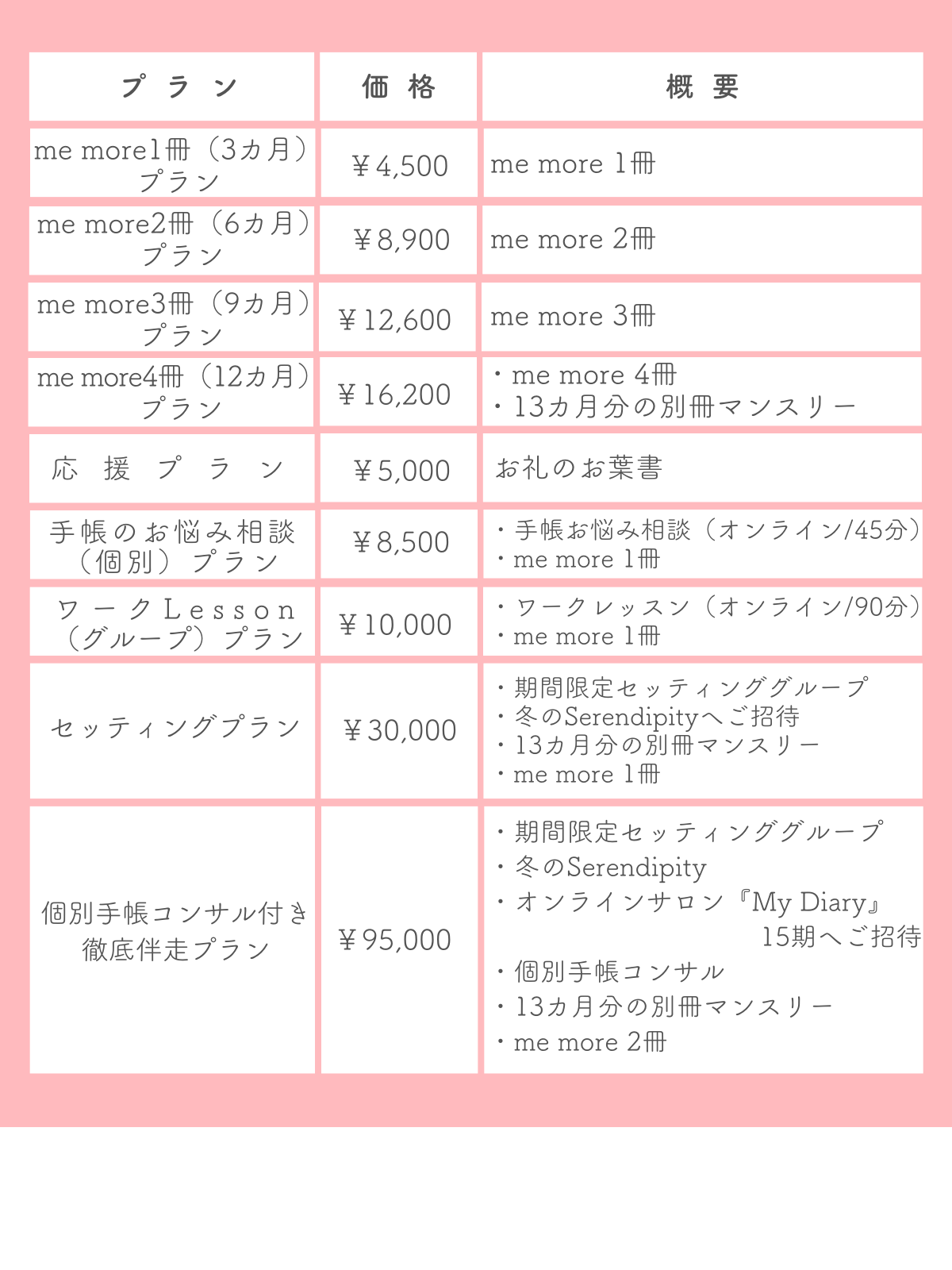 「me more 4冊(12カ月)プラン」・「セッティングプラン」・「個別手帳コンサル付き徹底伴走プラン」をご支援いただいた方に手帳と一緒にお届けいたします。