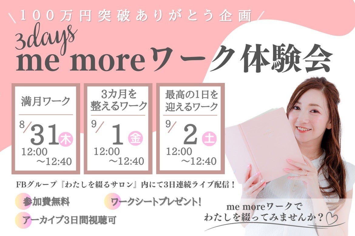 100万円突破ありがとう企画!!3Days me moreワーク体験会開催します。みなさま、こんにちは。me more 手帳プロデューサーの松本真季(まみ)です。おかげさまで、今回のプロジェクトは開始後24時間で200%を達成し、3日で100万円という、たくさんのご支援をいただきました。本当にありがたく、ご支援くださった皆様に感謝しております。そんな感謝を込めて、大変急ではありますが、本日から3日間連続で今回のme moreに掲載してありますワークの体験会をFacebookグループ『わたしを綴るサロン』内にてLIVE配信いたします。・すでにご支援いただいた方・リターンを決めかねている方・me moreが気になる方・ワークが気になる方どなたでもご参加いただけます。ぜひこの機会にme moreワークを体験していただけたら嬉しいです♪お気軽にご参加ください。詳細は下記の通りです。100万円突破ありがとう企画!3Days me moreワーク体験会☆ワークシートプレゼント付き!開催日時:8月31日(木) 12:00〜12:40 満月ワーク9月1日(金)12:00〜12:40 3ヶ月を整えるワーク9月2日(土)12:00〜12:40 最高のわたしを迎えるワーク参加方法:Facebook グループ『わたしを綴るサロン』内で開催いたします。以下のURLをクリックの上、参加申請をお願いいたします。↓https://www.facebook.com/groups/6309005765815101/※アーカイブは3日間保存いたします。リアルタイムでご参加できない場合は録画でお楽しみいただけます。※プレゼントのワークシートは、上記のFacebookグループないにてダウンロードしていただけます。『わたしを綴るサロン』は、わたしを綴って人生を変えていく!もっと自由に輝く女性に♡書くことをお伝えしていくサロンです。どなたでも無料でご参加いただけます。今後ともどうぞよろしくお願いいたします。me more手帳プロデューサー松本真季(まみ)