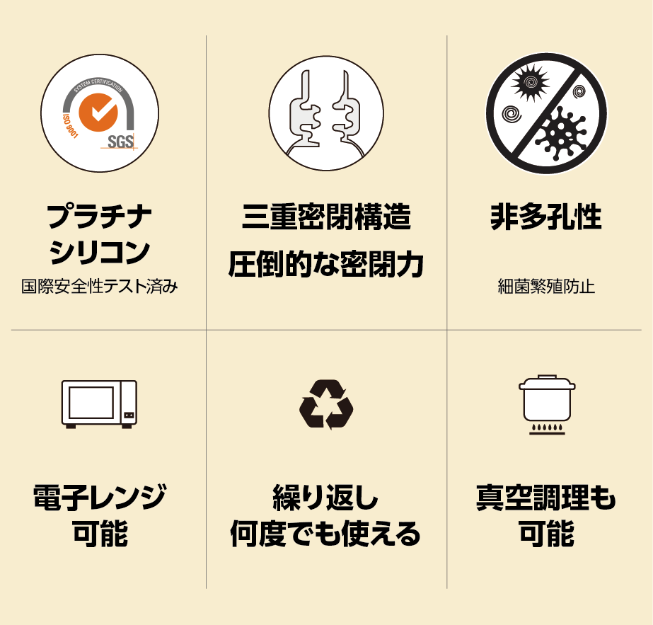 当社の製品は空気との接触を最小限に抑え、水分の蒸発防止により、食べ物をより新鮮に保存することが出来ます。