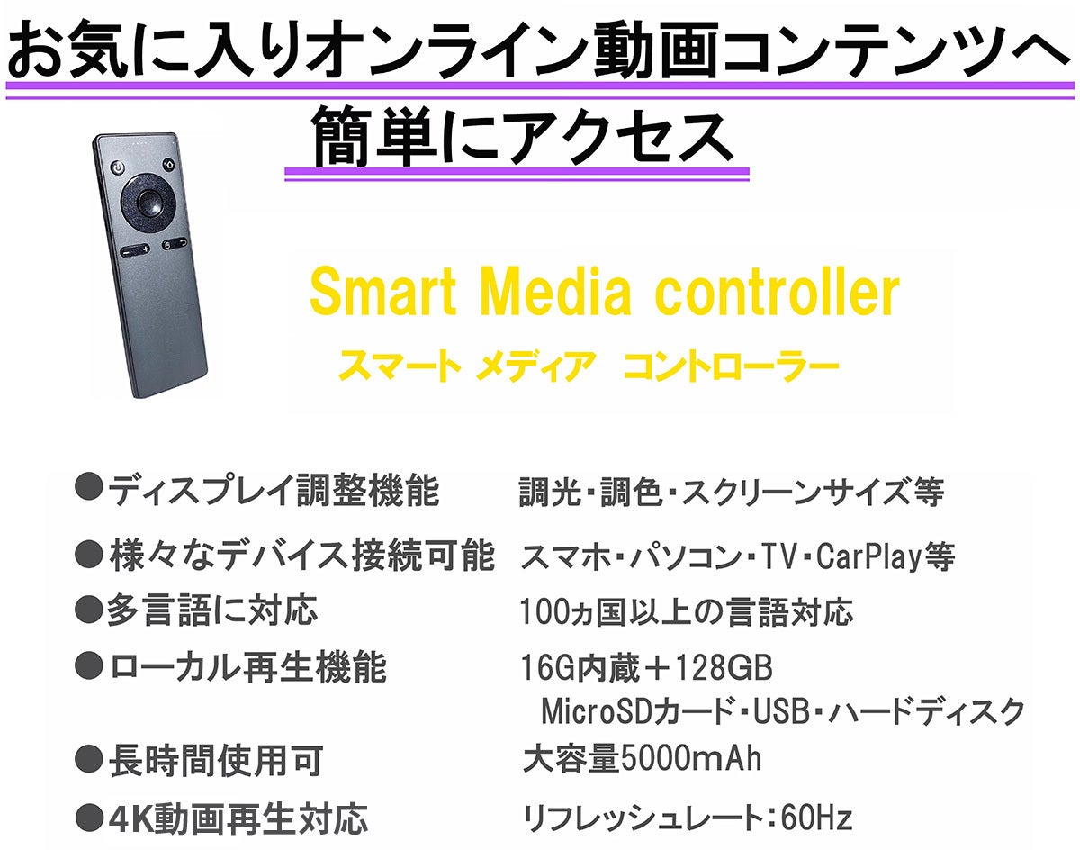 また、メディアコントローラーにお好きな動画を保存しておけば、屋外、飛行機や新幹線など移動中でもいつでもどこでも観ることができます。