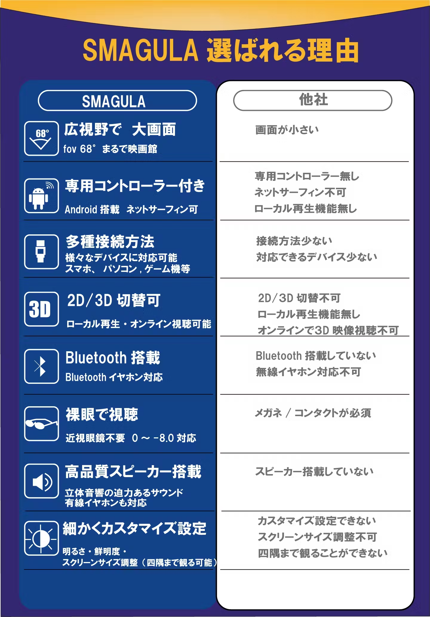 SMAGULA 3Dスマートグラスは視度調整機能付き、0~-8.0の近視の方でもメガネやコンタクトが なくてもピント調整しクリアな映像を裸眼でお楽しみいただけます。