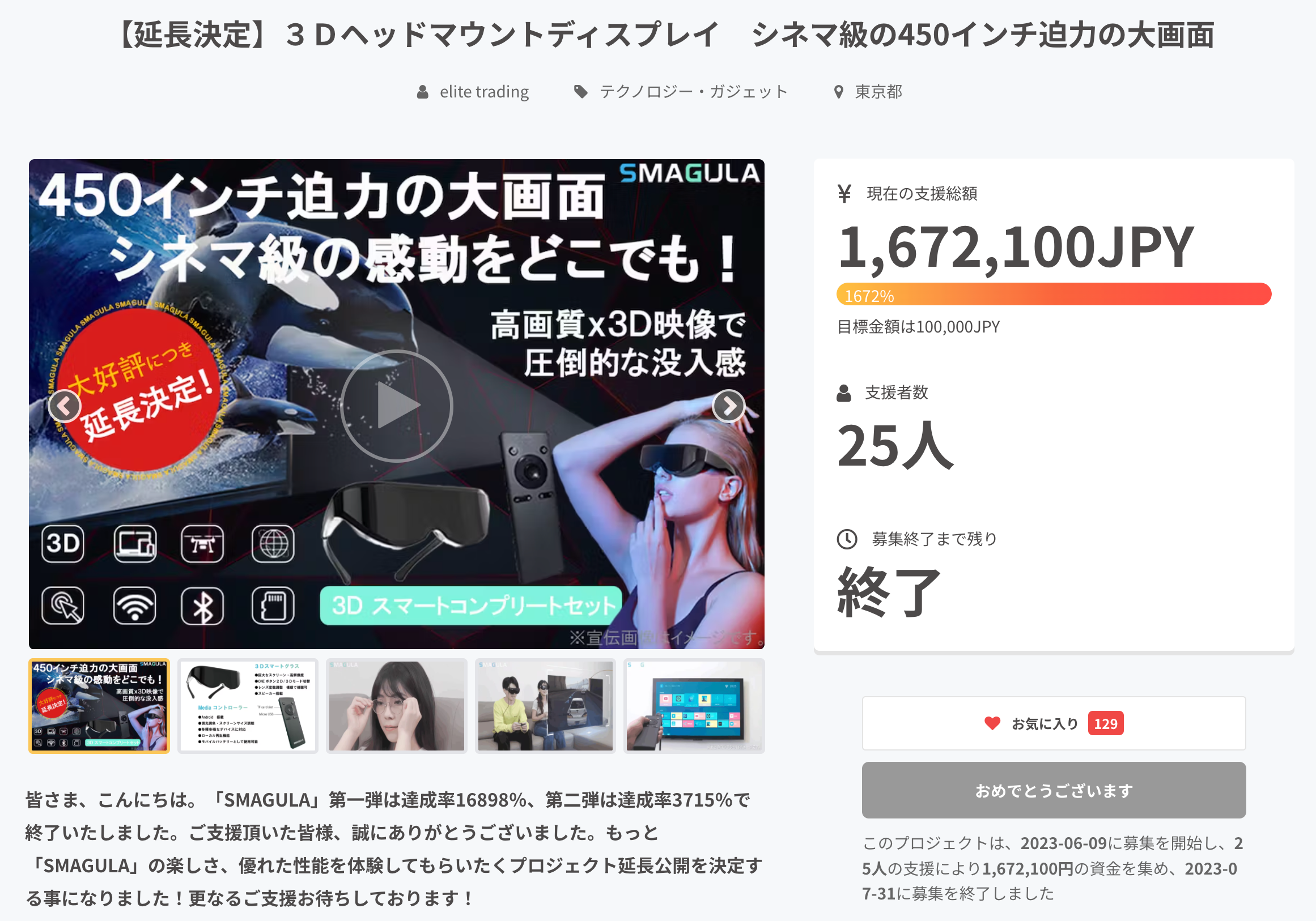 2023/06/09 12:50この度は「SMAGULA」に興味・関心をいただきまして、誠にありがとうございます。「SMAGULA」第一弾は達成率16898%、第二弾は達成率3715%で終了いたしました。ご支援頂いた皆様、誠にありがとうございました。大好評にて3Dヘッドマウントディスプレイ「SMAGULA」をご要望にこたえ追加生産し、延長公開としてプロジェクト開始いたしました。この機会に是非ともご支援お待ちしております。【特長】●巨大スクリーン&高解像度FOV68°視野角&1600×1600ピクセルのLCD。ワンボタンで2D・3D切り替え可能で、 シネマ級の感動をどこでも。● メガネ不要。視力調整機能付き。裸眼で視聴可能。● 様々な機器と接続 多人数同時使用可能。スマホ・パソコン・ゲーム機・ドローン対応可能。● APPダウンロード機能・ローカル再生機能。コントローラでAPPをDLすれば、映像を本体に保存しどこでも視聴。 もっと見る