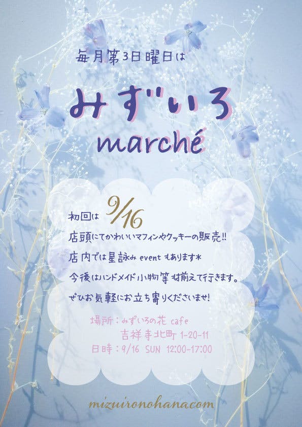 2018/08/28 23:03近隣の方がお店に入りやすいきっかけになればと 店頭でみずいろmarchéを月に1度開くことにしました。 こちらでかわいいお菓子やハンドメイド小物等売って 行きたいと思います。 もっと見る