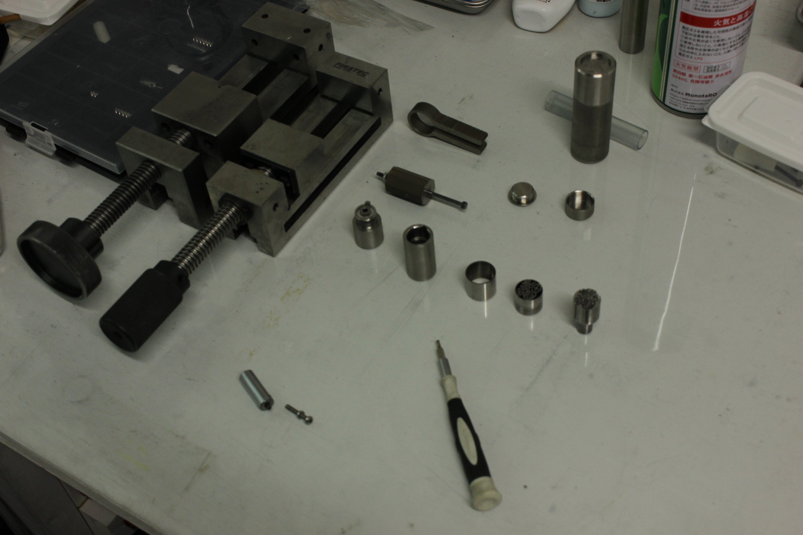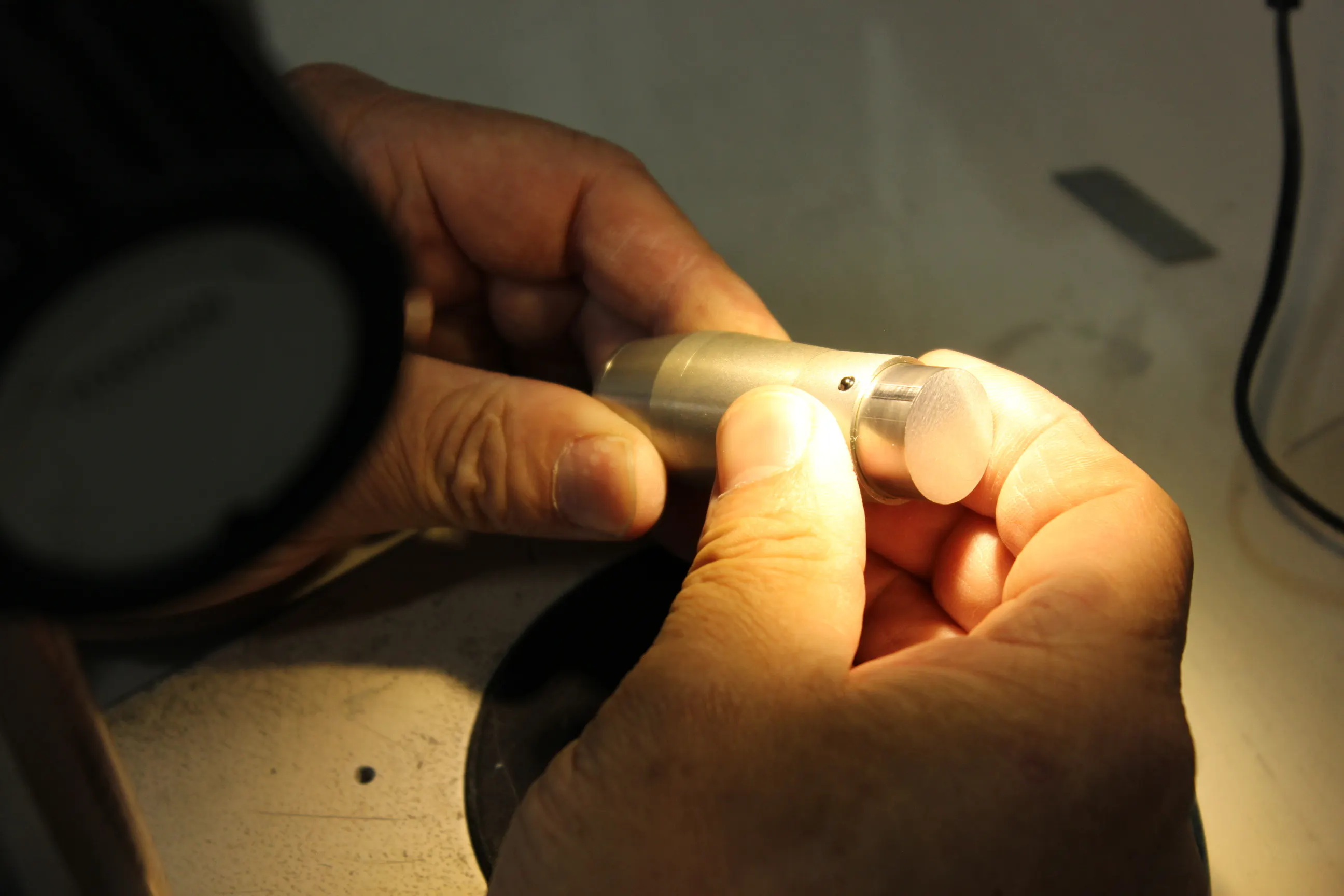 φ19mmの金属素材の中に文字デザインが現れ、消えるというのをいかに簡単に操作ができるか?という構造の構築にとても時間を費やしました。また、雄部品と雌部品のクリアランスを部分部分で変え、動きにスムーズさを追究し、加工が0.002mm(2μ)まで追求しました。そして何より、持ちやすさ、押しやすさを追求した形状。持った瞬間に手の全体にしっくりくる形。たくさんの試作品を作り、たくさんの方に触れていただき、たどり着いた形が「くびれ形状」です。小さな会社だからこそ他にできないことを好む私たち。だからこそ、苦労を楽しみ社員一同で時間を費やしできた商品です。
