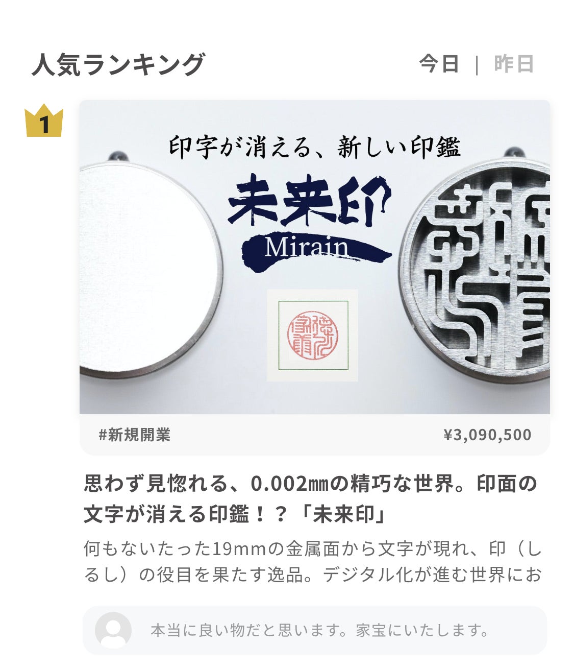 皆様こんばんは。岩井プレスです。本プロジェクトも残り7日間となりました。10月いっぱいでこちらのプロジェクトは終了し通常売価にて販売させていただきます。さて、本日AM7時にGIZMODOにて当社の未来印の記事が公開されました。是非、皆様に記事を読んでいただければと思います。https://www.gizmodo.jp/2023/10/machi-ya-mirain-review2-679687.html?utm_source=dlvr.it&utm_medium=twitter&utm_campaign=2e137ee95afa418002a5a5c8f1cbd628伝統工芸と技術のコラボを実現した私たちは更なる発展を目指して私たちの技術を通して皆様に知っていただく活動をこれからも続けていきたいと思います。末永く応援の程よろしくお願い致します。