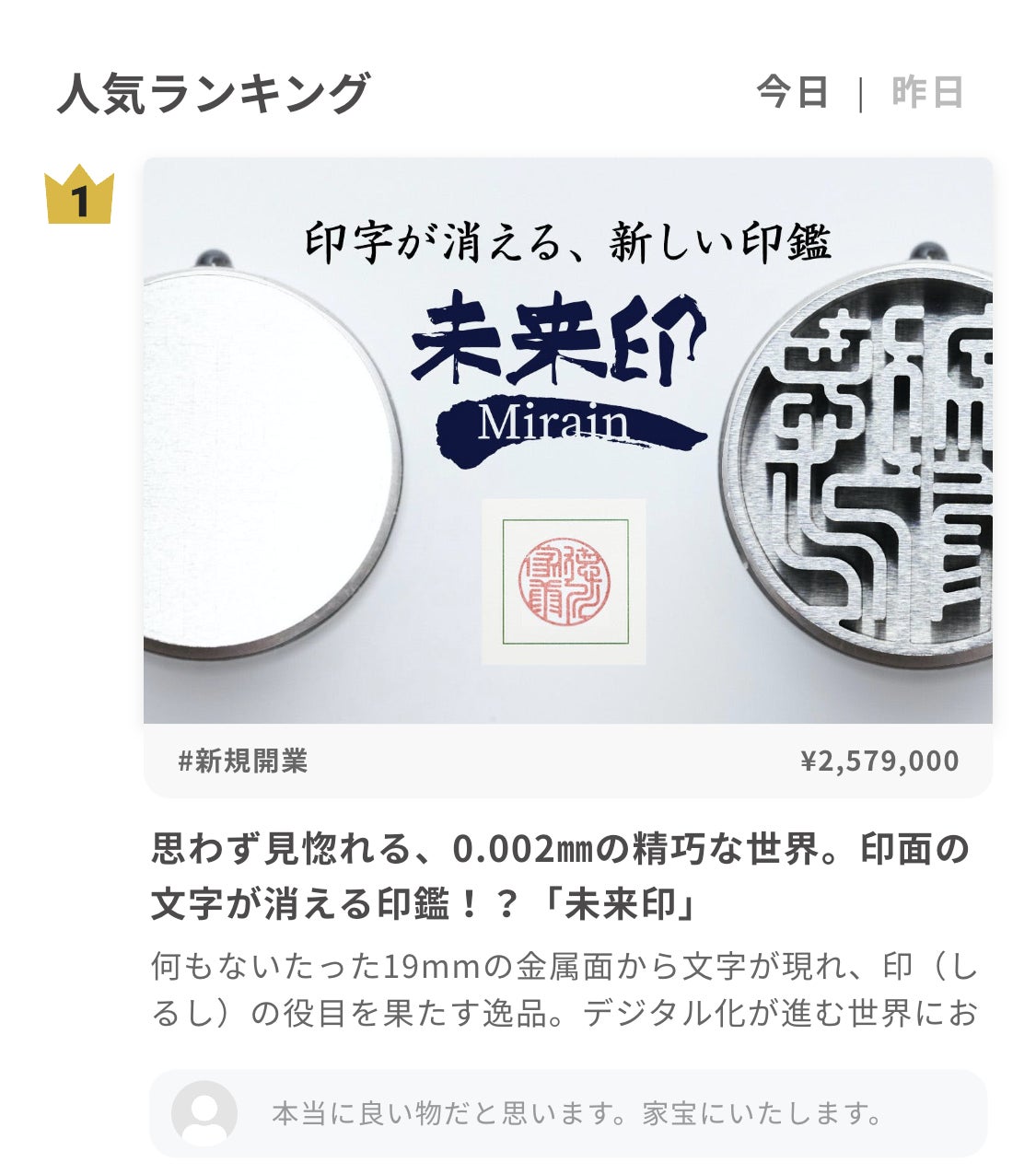 皆様こんばんは。いつも大変お世話になっております。岩井プレスです。残り日数が11日間となり、最終段階に入ってきました。当社がどんな思いでこの「未来印」を作ったのか再度ご説明させていただければと思います。何もないたった19mmの金属面から文字が現れ、印(しるし)の役目を果たす逸品。デジタル化が進む世界において、あえて「ものを使ってしるし」を残すことの意味が問われる現代、必要な時にだけ自分のアイデンティティーを示すようにしるしが出てくるシステムを、私たち金属加工のプロが挑んで生まれました。あえてものを使ってめんどくさいことを行うことで、この一押しの重みを実感できるのではないのでしょうか?自分たちが経験してきた大切なものを購入する時、とても重圧な一押ししてきた伝統的な儀式をこれからも引き継いでほしい。そんな思いから「未来印」というネーミングになりました。そんな想いこもった逸品を是非皆様に使用していただきたいそんな願いが込めれれています。ご支援様の中にはうれしい限りのコメントを頂戴しております。「本当に良い物だと思います。家宝にいたします。」「所有する喜びが満たされそうです。応援しています! 」 等々本当にうれしい限りです!是非、残りの日数お得な価格で購入していただければ幸いです。※先日lifehackerにて記事が紹介されましたので、皆様にも読んでいただければと思います。https://www.lifehacker.jp/article/machi-ya-mirain-review2-679687/