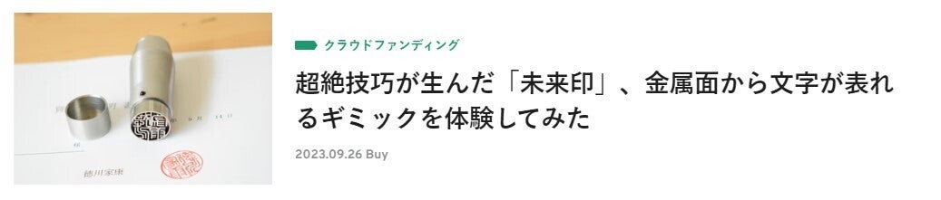 皆様こんばんは。岩井プレスです。昨日、lifehackerにて当社の「未来印」が2回目の記事として掲載されました。実際に使っていただき、使用感、重量感、驚き感を体験していただきました。印鑑は廃止といわれながらも、大きな契約を交わす際、例えば家の購入、車の購入等々大きな買い物をする際には、まだまだ「実印」は現役の4番バッターです。皆様が、経験しただろう大きな契約をする際の「押印」というものは、先祖代々引き継がれるものであって、まだまだ実印という物は必要になるのではないかと思います。そんな私たちがこの「未来印」に掲げる思いは、「親から子へ」「おじいちゃんから孫へ」そんな未来に託す。この一本が大きなメッセージになるのではないかと思いながら作っております。是非とも未来の子たちにこの未来印を託してみてはいかがでしょうか?https://www.lifehacker.jp/article/machi-ya-mirain-review-679687/