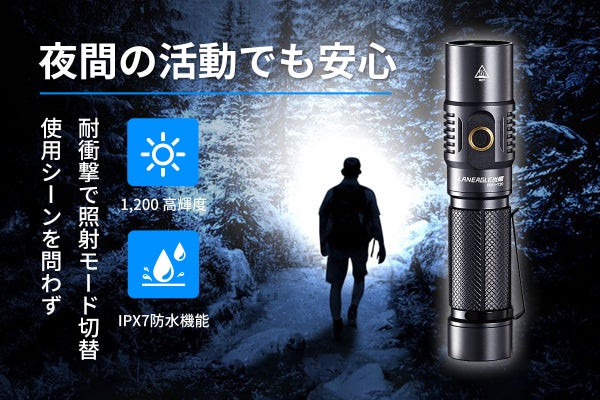 コンパクトボディーなのに最大1,200 ルーメンを照射でき、手元はもちろん遠距離まではっきりと照らします。登山やキャンプなどのアウトドア、災害時や夜間の行動の際に貴重な光源として活用できます。