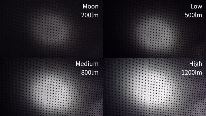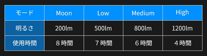 常時点灯モードはMoon・Low・Medium・Highの4モードを採用しています。