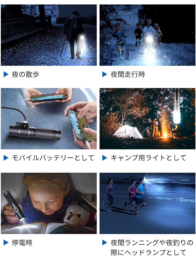 光を収束させてしっかり照らせるので、日常使いはもちろん、アウトドアや作業、災害時など夜間の行動においてはシーンを問わずに使用できます。