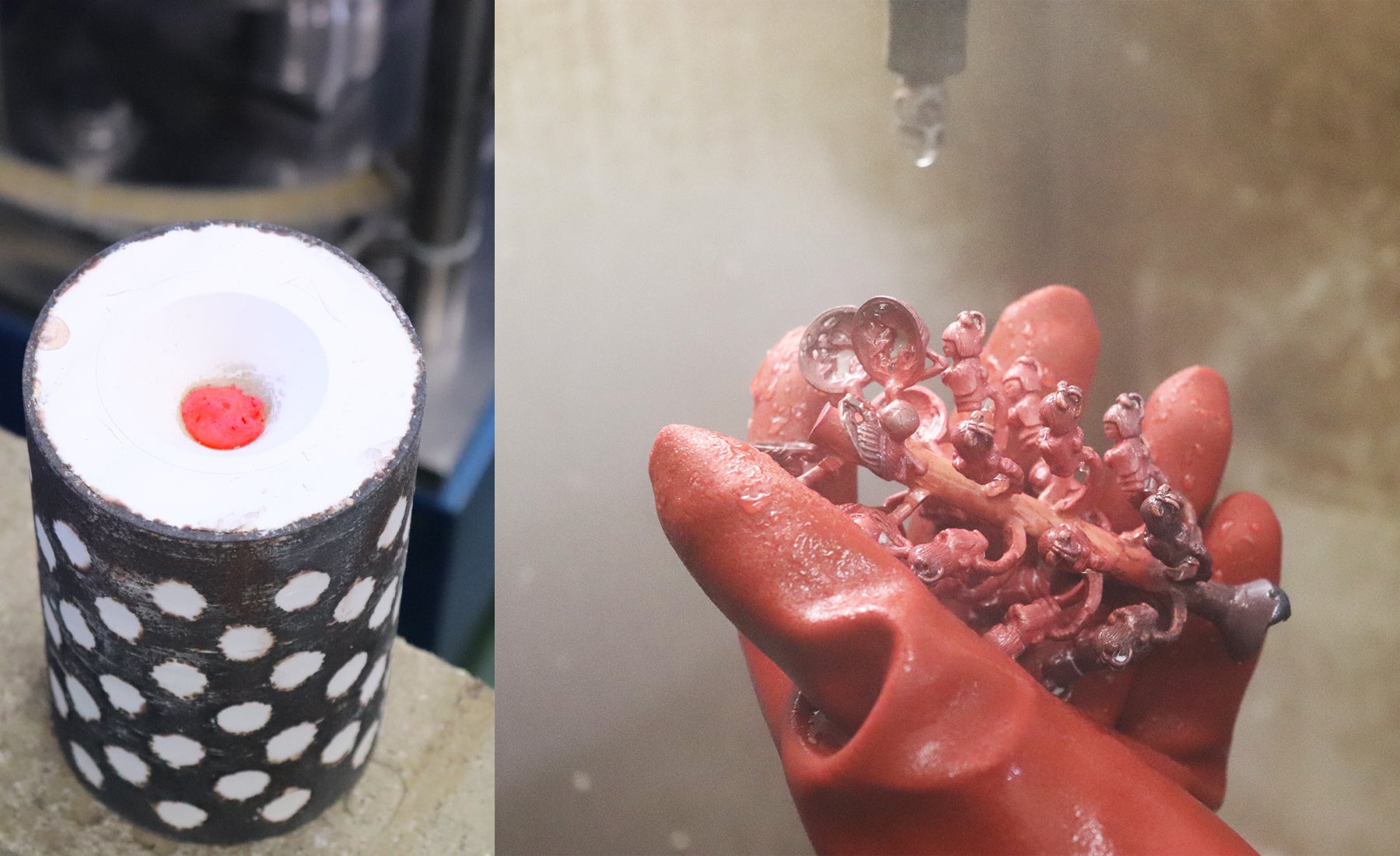 チャレンジしてみて分かったことなのですが、純銅は融点が高い上に温度管理が非常に難しく、機械を傷めてしまうリスクも伴うため、鋳造には不向きな素材なのです。熱がこもりすぎると膨張して鋳型の石膏を破壊しぼそぼその仕上がりに・・・。