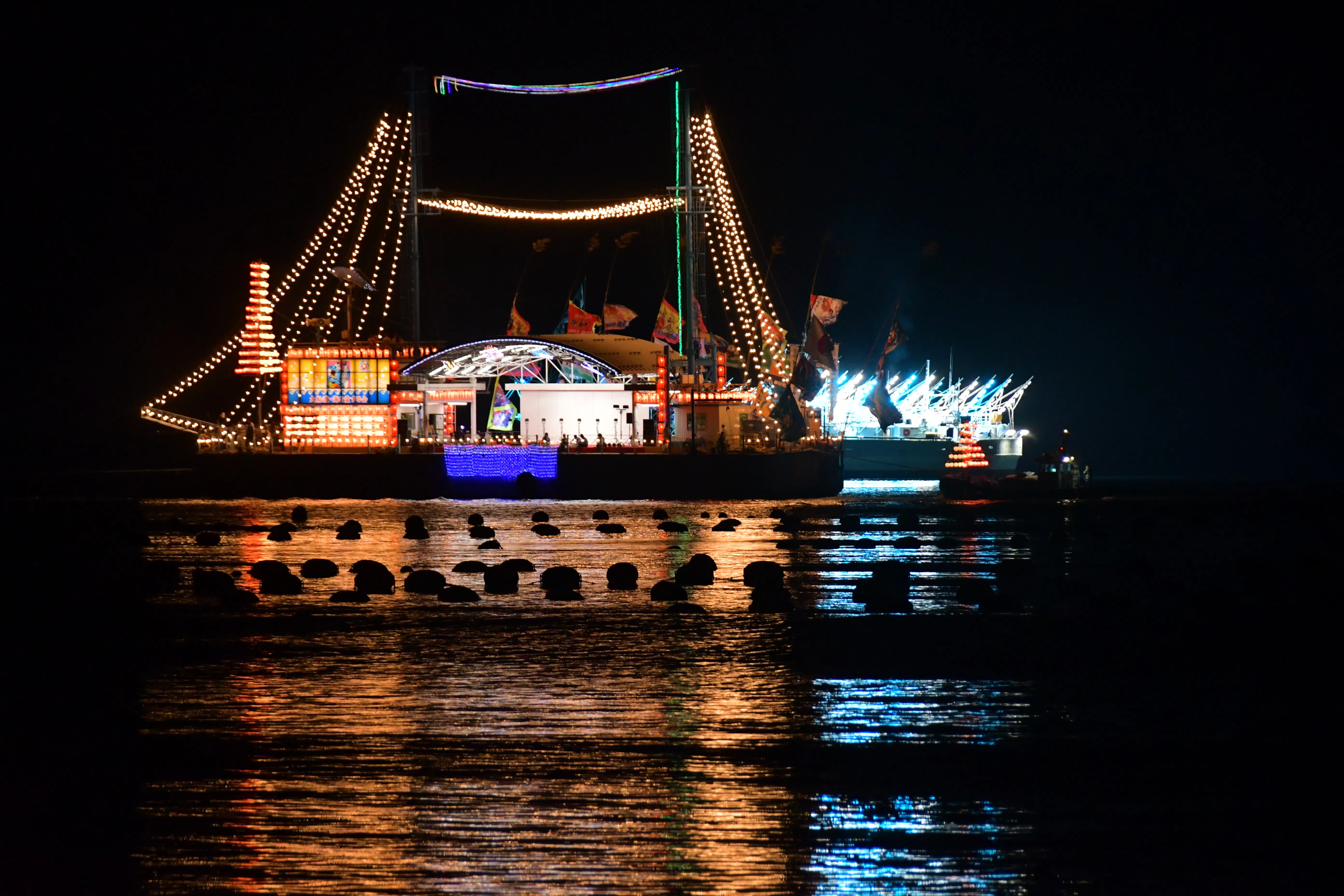 三陸・大船渡夏まつりの花火大会はリアス式海岸という地形の特徴を生かし、観覧場所の岸壁からほど近くで放たれる水上花火や、対岸でのナイアガラの滝、大漁旗と電飾で装飾した船団「七夕船団」が水面に移る花火と共演するという他の地では観られない特徴があり、市内外を始め多くの方々に親しまれてきました。