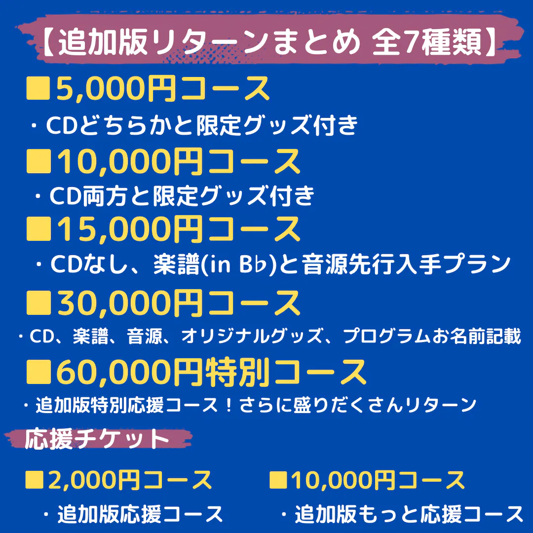 ※資金が100%を上回り、さらに支援額が増えるごとに、2ndゴールとして制作面でより良い形に仕上げられるように努めます。特に、DTM音源制作された音をCD作品に追加したり(←最優先。)、MV制作や遠征コンサート等も視野に入れて考えています。