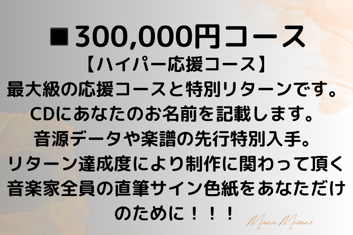 【ハイパー応援コース★ 最上級の応援コース。CDにあなたのお名前を記載します。音源データや楽譜の先行特別入手、リターン達成度により制作に関わって頂く音楽家全員の直筆サイン色紙をあなただけの為に。】