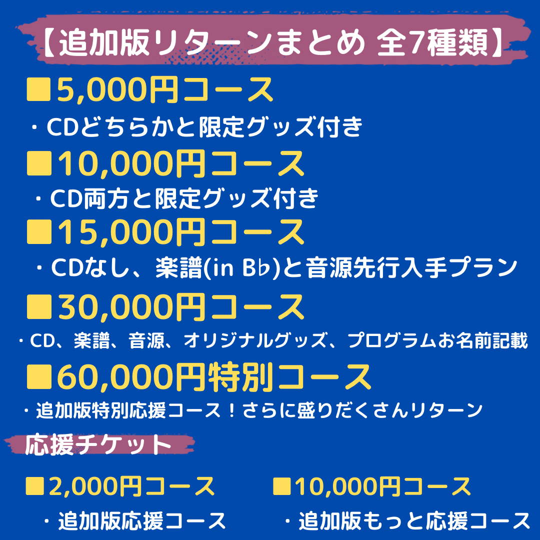 ※資金が100%を上回り、さらに支援額が増えるごとに、2ndゴールとして制作面でより良い形に仕上げられるように努めます。特に、DTM音源制作された音をCD作品に追加したり(←最優先。)、MV制作や遠征コンサート等も視野に入れて考えています。