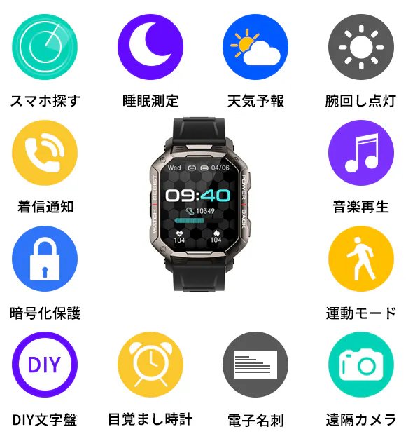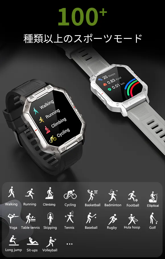 ウォーキング、ランニング、ハイキング、テニス、ダンス、縄跳び、トレッドミル、バスケットボール、バドミントン、サイクリング、サッカー、フラフープ、ヨガ、卓球、ジム、ゴルフ、バレーボールなど、100種類以上のスポーツモードに対応。また、消費カロリーや運動データを正確に把握、より良い運動効率を!