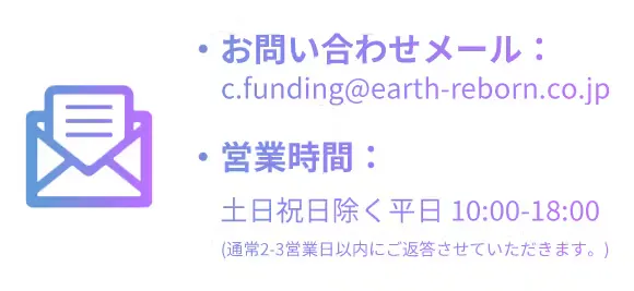 お問い合せは「c.funding@earth-reborn.co.jp」宛てにご連絡をお願いいたします。