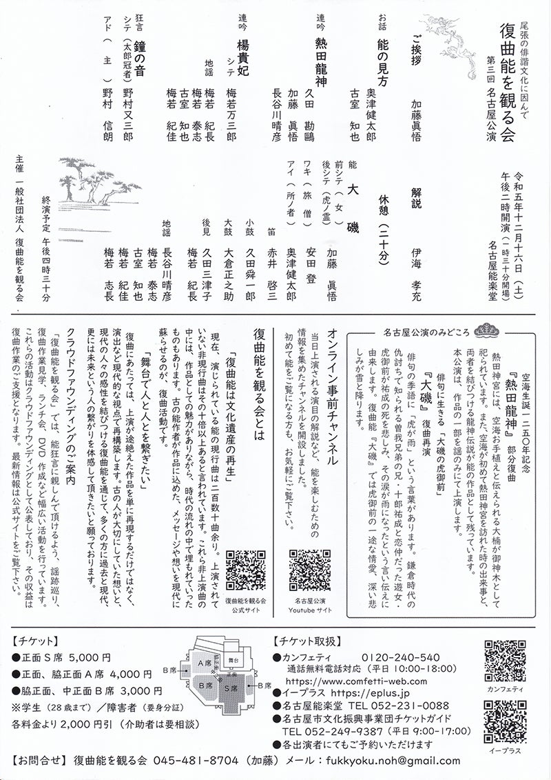 内容:復曲能〈大磯〉/ 部分復曲〈熱田龍神〉