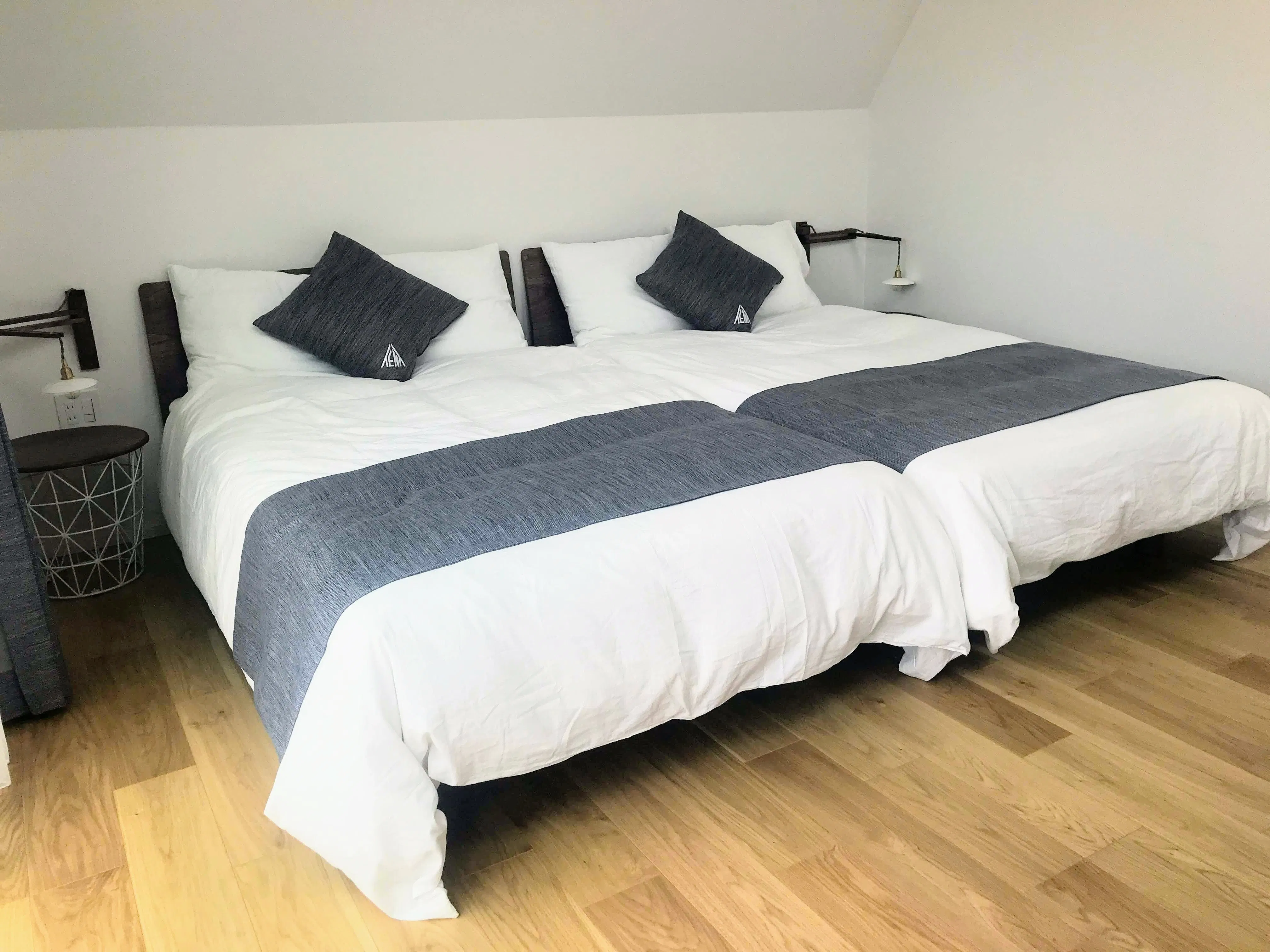 室内約14畳。シモンズのセミダブルベッド×2 最大4名さま宿泊可能ですが、2名様推奨です。備え付けのソファーベッドをご利用いただけます。