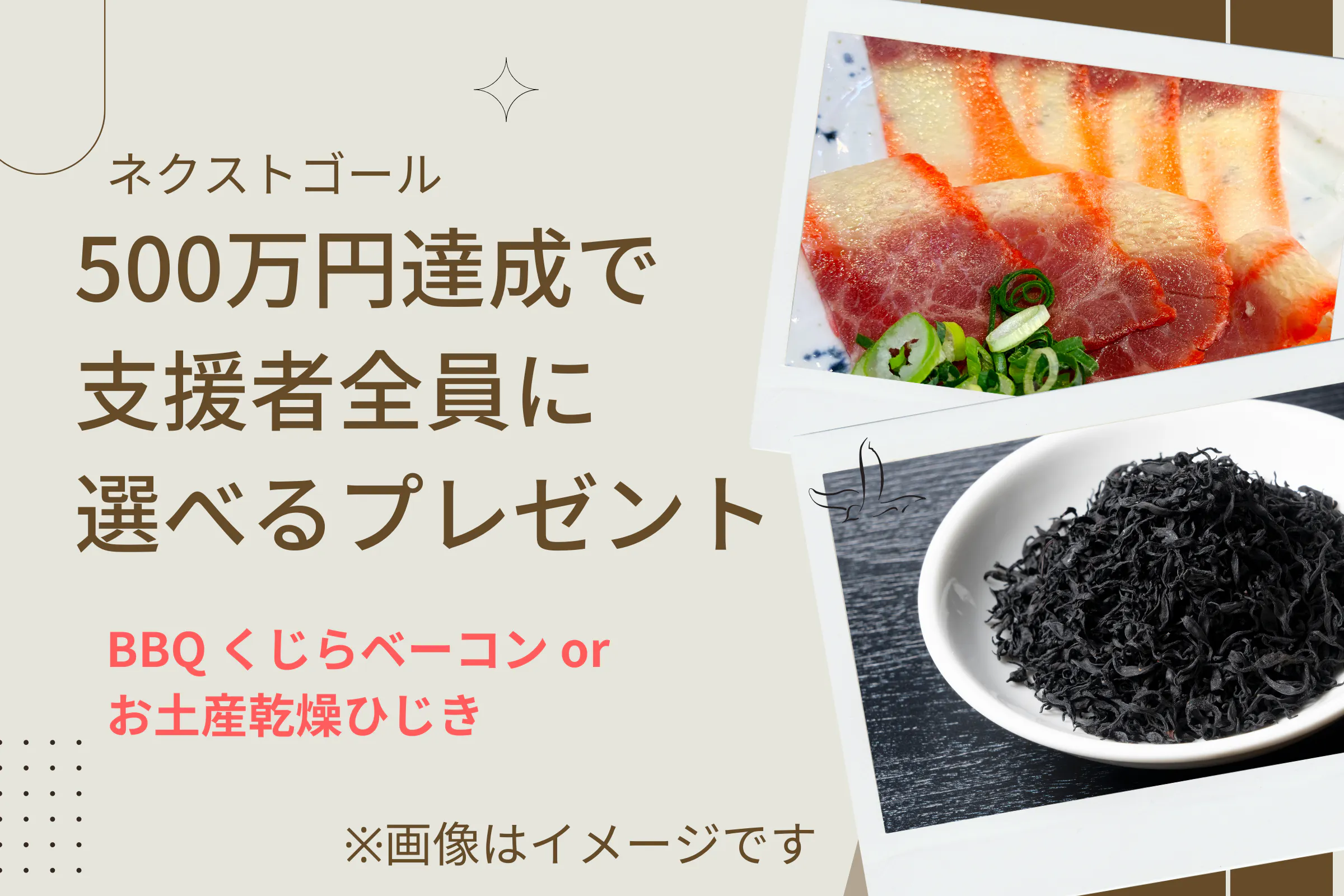 500万円達成した際には、私、中村からのささやかなお礼として、支援者全員に(これまで支援した方も含みます)宿泊時に地元の名産品である「くじらベーコン」か「乾燥ひじき(お持ち帰りできます)」をどちらかプレゼントいたします!