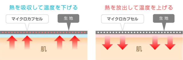 真夏でも、真冬でも、人間がいちばん快適だと感じる温度(31℃~33℃)をキープしようと働きかけます。ずっと快適な温度にコントロールしてくれる、最先端温度調節素材なのです。