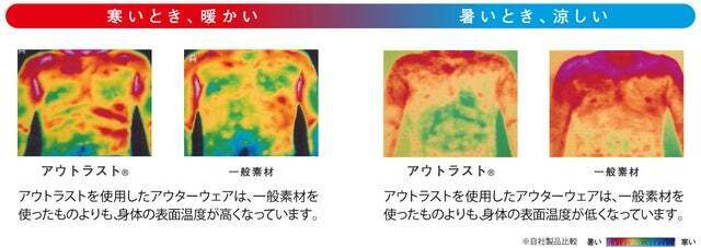 サーモグラフィーでは、真夏の炎天下でも肌表面温度は他の素材よりも低く、真冬でも暖かいことが確認されています。
