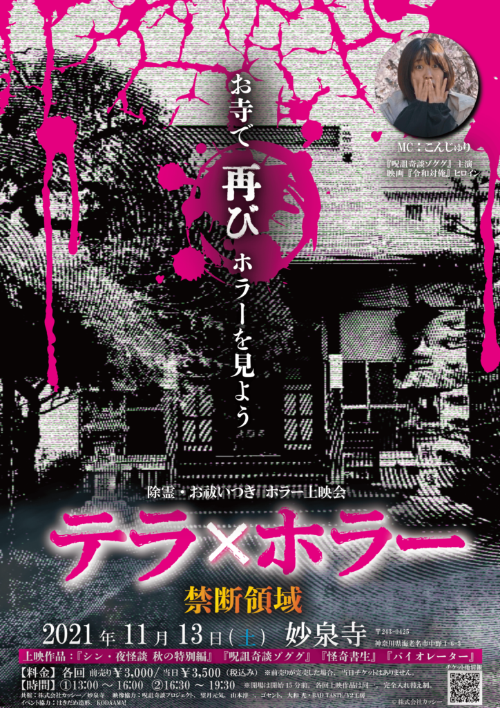 これまで、お寺でホラー映画を上映する「テラ×ホラー お寺でホラーを見よう!」を主催したり、ホラー映画を製作し映画祭に出品するなどホラーに関する企画をいくつも形にしてきました。また、映画の制作や配給、宣伝、美術制作を行うなど映像制作全般にかかわる事業を行っています!