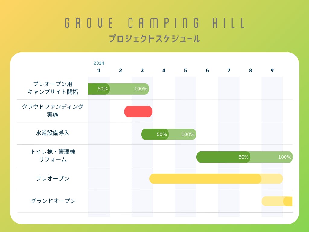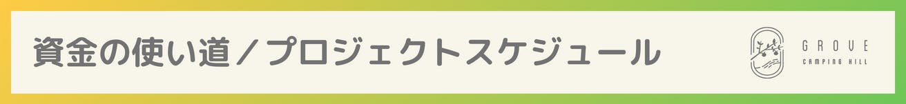 最後に、クラウドファンディングで募る支援金の使い道と、GROVE camping hillのオープンまでのスケジュールについて説明させていただきます。