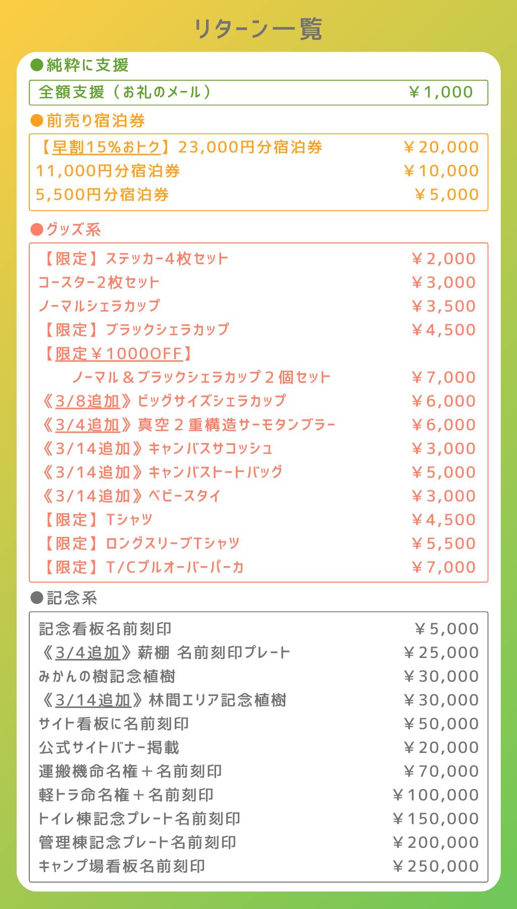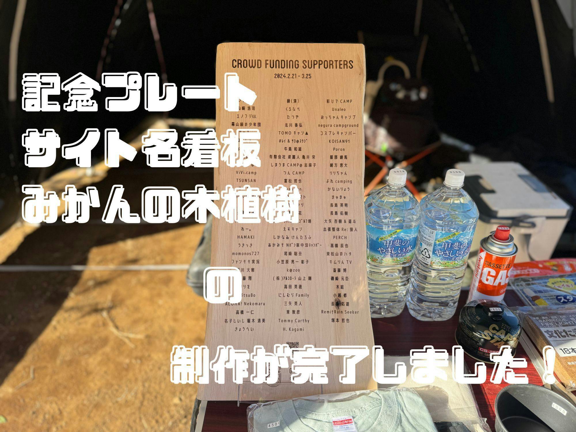 2024/11/30 17:10支援者の皆さま、ご無沙汰しております。GROVE camping hillオーナーの長島です。たくさんの皆さまのご支援をいただきスタートした当キャンプ場ですが、今年3月末のプレオープンから約8ヶ月が経ち、たくさんのキャンパーさんが当キャンプ場で過ごす時間をお楽しみいただいております。本当に皆さまのご支援あってのことです。改めて、御礼申し上げます!満員御礼の日も増えてきました!さて、長らくお待たせしておりました名前刻印系のリターンですが、制作が完了し、本日キャンプ場に設置いたしましたことを報告させていただきます。【記念プレート名前刻印】総勢87名の支援者さまの名前を刻印した記念プレートです。まだ管理棟の建築は着手できていないため、受付テントに掲示いたしました。【みかんの樹記念植樹プレート】海を望める「みはらしサイト」に計10本の柑橘類の木を植樹し、それぞれの樹種と支援者さまの名前を刻印した記念プレートを設置しました。【サイト名看板】2つのサイト「みはらしサイト」「こもれびサイト」の案内看板に、支援者さまのお名前を刻印して掲示しました。なお、今回のお名前刻印について、失礼ながら全て敬称抜きにて刻印させていただきました。支援者の皆さまお一人お一人は、当キャンプ場を一緒に作ってくださった「仲間」だと、勝手ながら思っておりますので、敢えてこのような形を取らせていただきました。ぜひ、当キャンプ場にお越しの際や、周りの方に宣伝していただく際は「このキャンプ場、俺が(私が)作ったんだぜ!!」って、自信満々に言ってくださると嬉しいです。─────────────────────これで、この度のクラウドファンディングのリターンは全て履行完了となります。改めまして、皆さまのご支援に心から感謝申し上げます。キャンプ場の開拓自体は、まだまだこれからやることが山積みです。管理棟の建築、場内通路の整備、新エリアのブッシュクラフトサイトの開拓、イベント等の企画などなど……これからも、人手も知恵も、たくさんの方のお力をお借りして「みんなで作るキャンプ場」のプロジェクトを進めていければと思っております。開拓に参加してみたい!とご興味をお持ちいただけた方は、ぜひメッセージ機能にてご一報ください。また、手軽にキャンプを体験してみたい、という方に向けた「手ぶらで焚き火だけプラン」など便利なプランも用意がございますので、ぜひ当キャンプ場へ足をお運びいただき、焚き火と景色の魅力をご自身の目でご覧いただけましたら嬉しいです。予約方法の詳細は、公式サイト(https://grove-yugawara.com/)をご覧ください。今後とも、応援よろしくお願いいたします! もっと見る