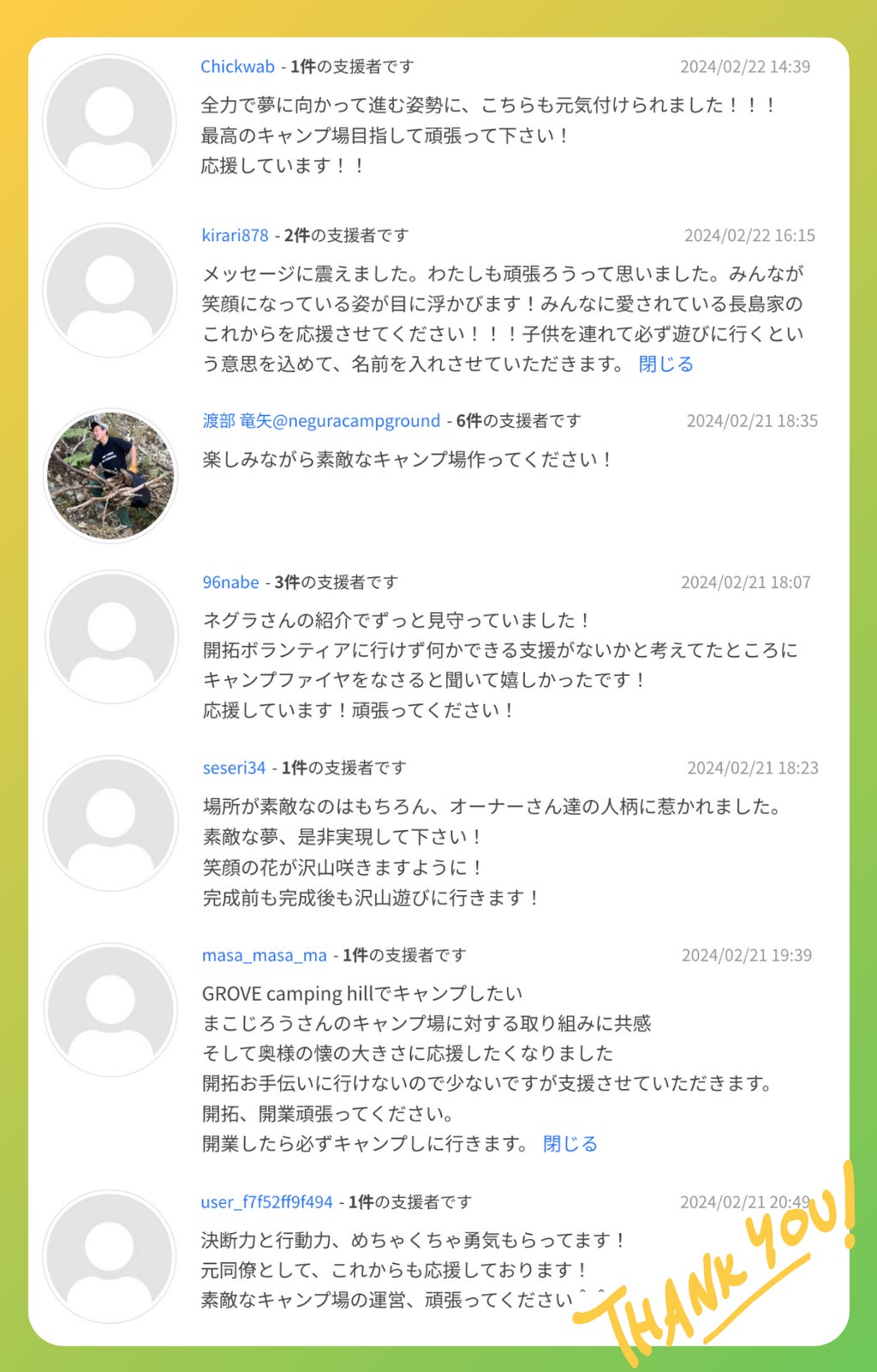 ご支援の金額はもちろんですが、支援者の皆さまからお寄せいただいた、あたたかく勇気をくれる応援の言葉に、僕も妻も心が震えております。