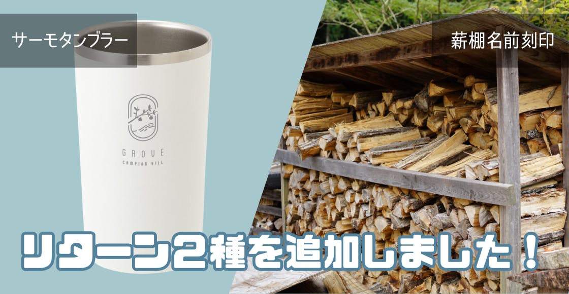 《真空2重構造サーモタンブラー(450ml)》と《薪棚 名前刻印プレート》が追加となりました!