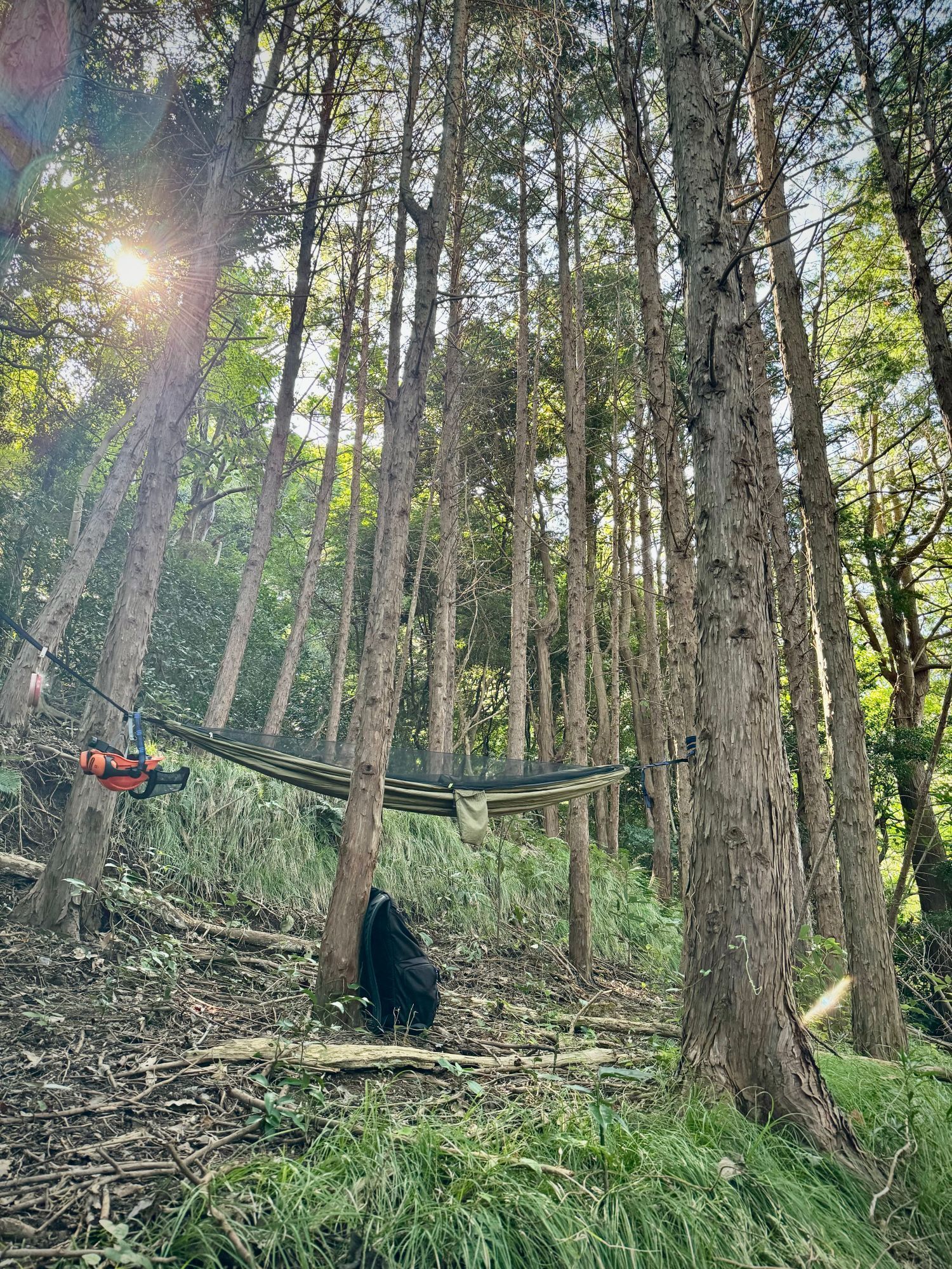 檜の香り漂う、野営感を味わえるハンモック・ブッシュクラフト向けの未開拓山林サイト。