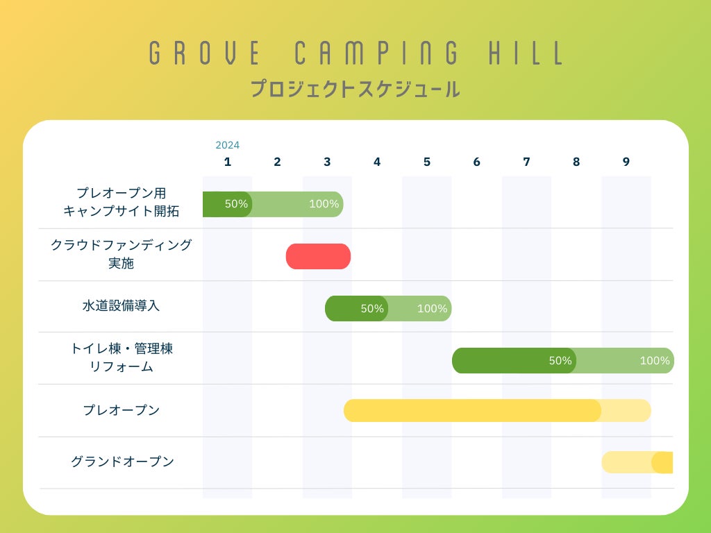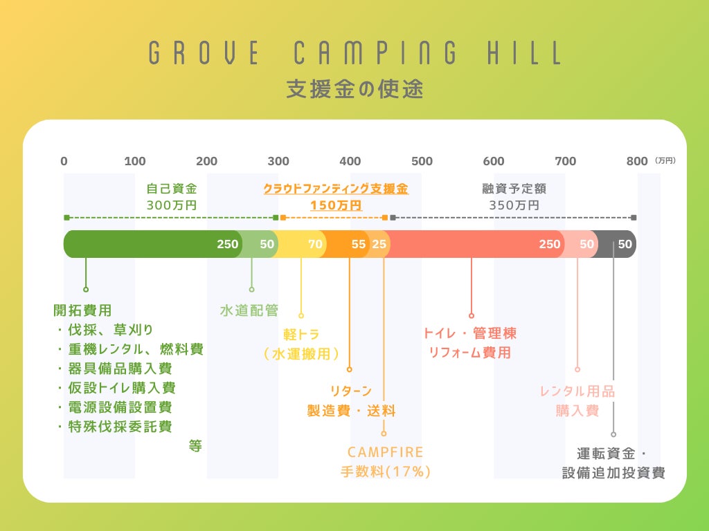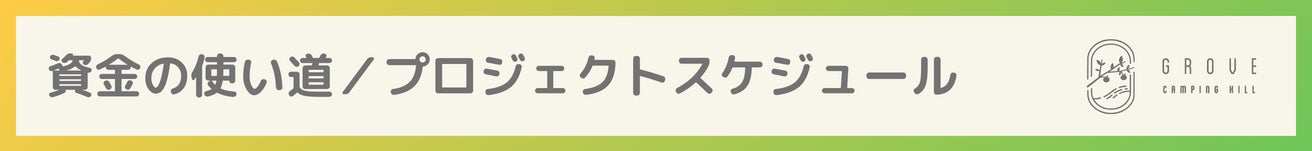 最後に、クラウドファンディングで募る支援金の使い道と、GROVE camping hillのオープンまでのスケジュールについて説明させていただきます。