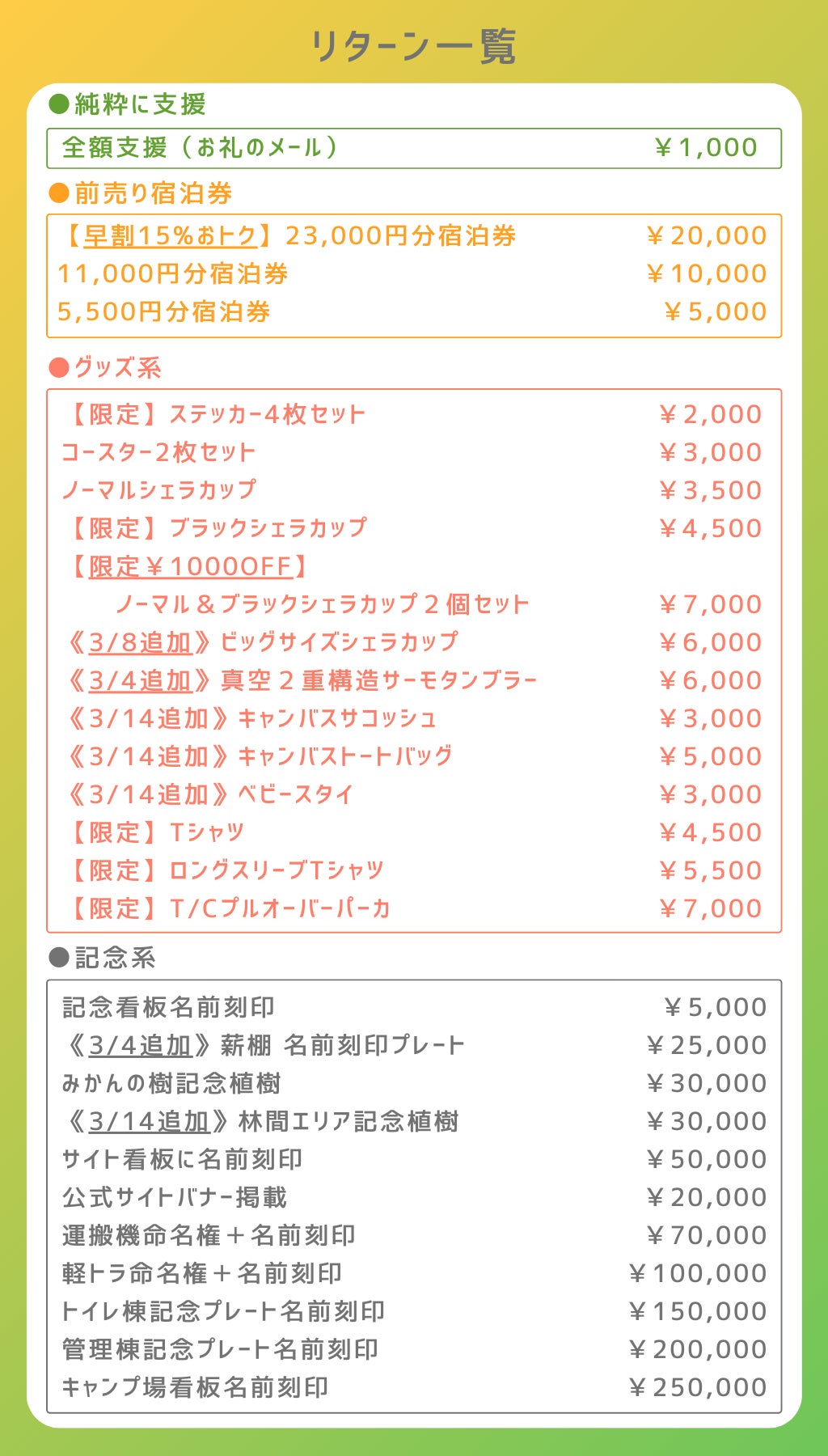 また、キャンプ場に形として残る記念看板刻印や記念植樹などのリターンも大変ありがたいです。