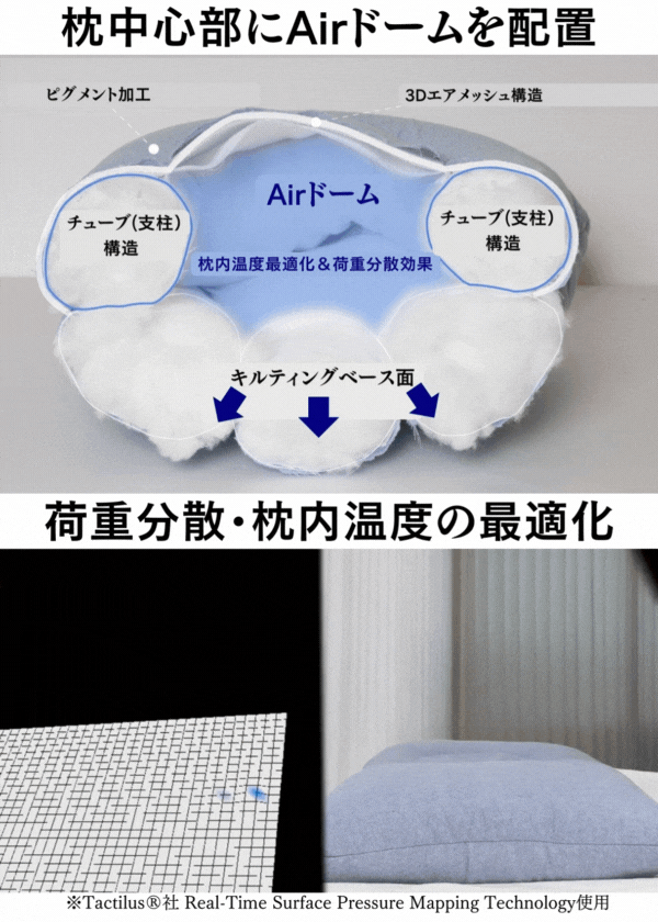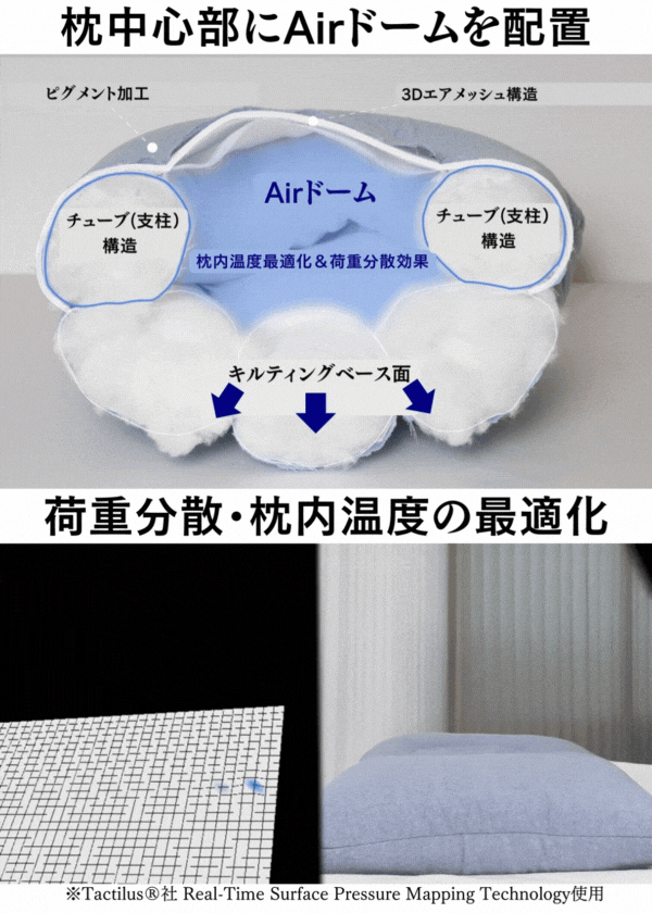 枕中心部は詰め物ではなくAirドーム構造のため、仰向けだけではなくあらゆる寝姿勢を快適にサポートします。