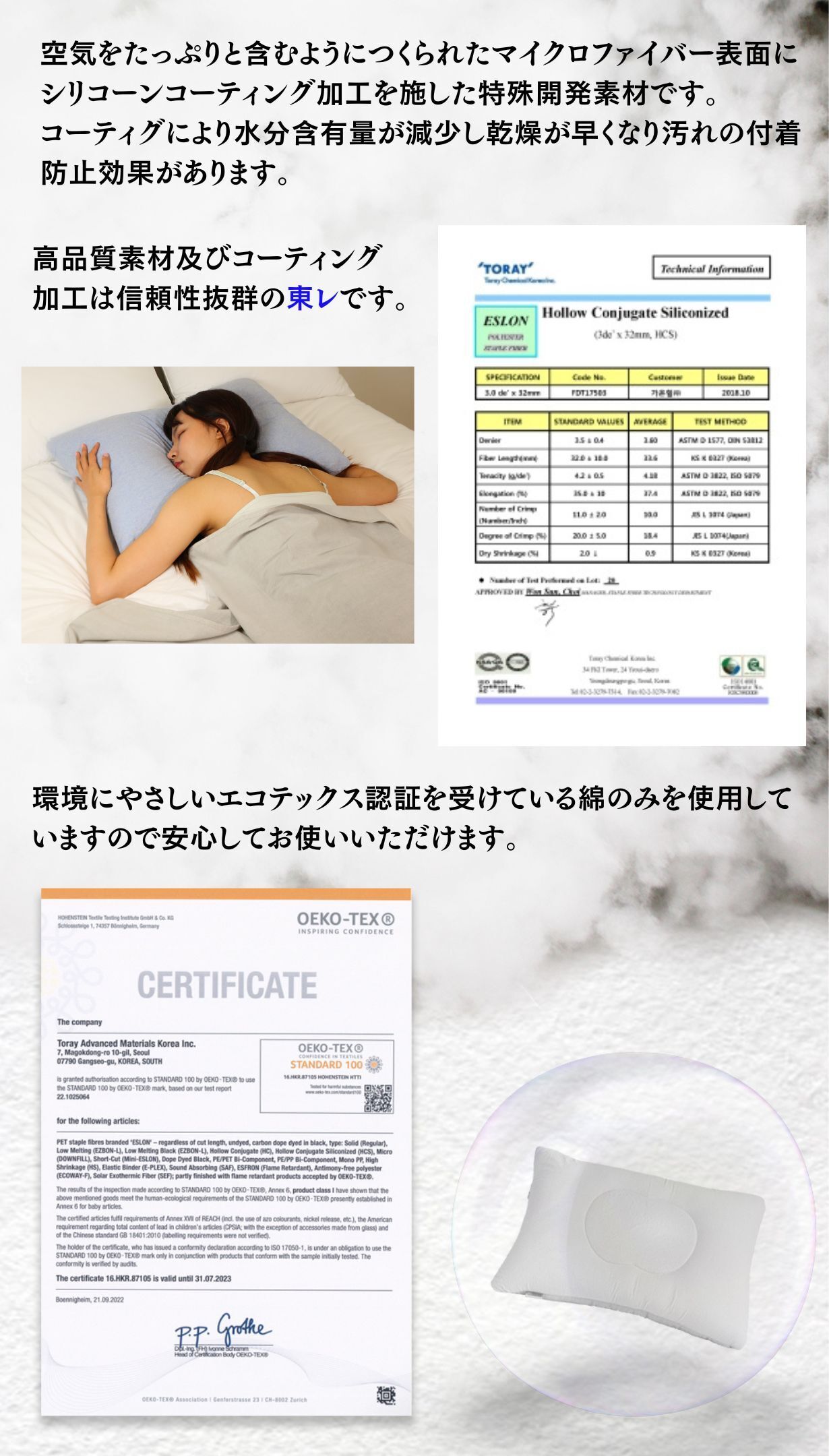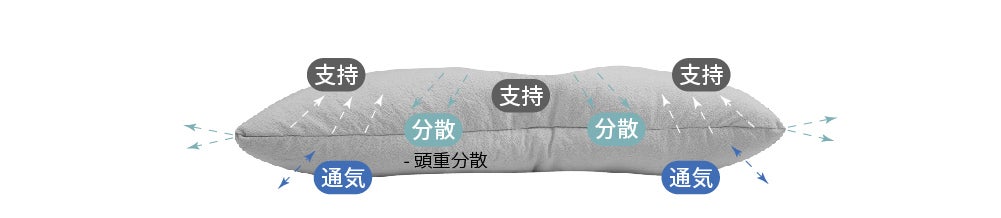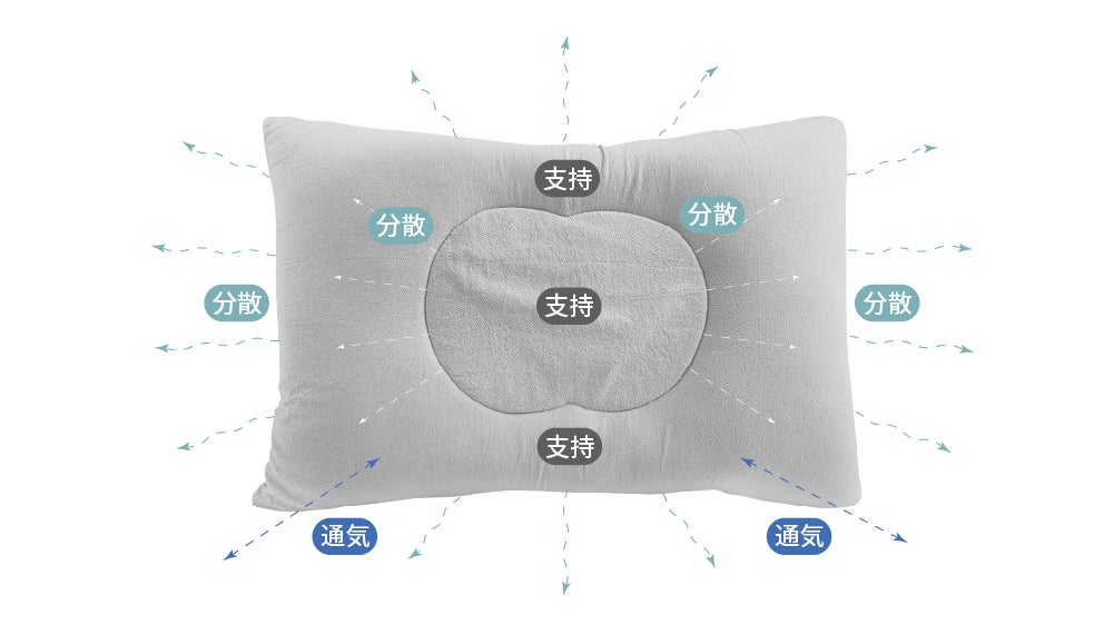 頭の部分の荷重は瞬時に分散され、支柱構造部分に詰められたマイクロファイバーが全体を優しく支えます。