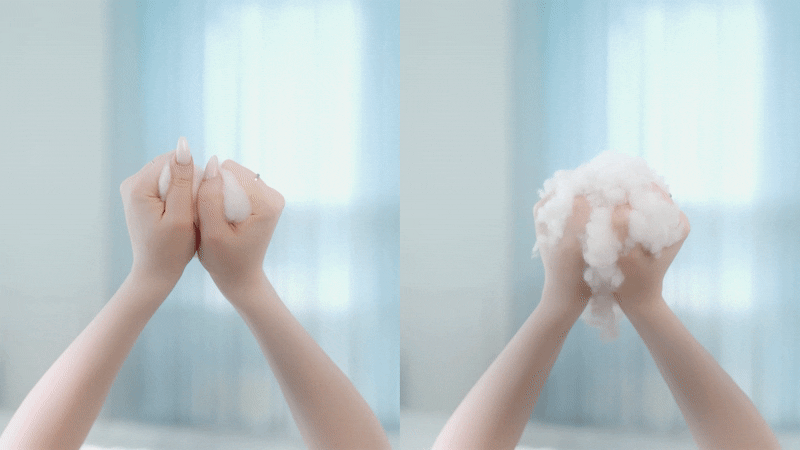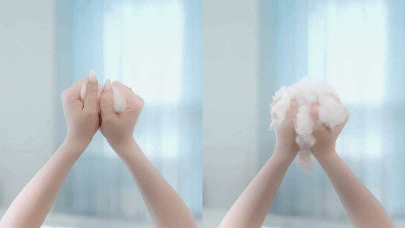 KUKI PILLOWはこのマイクロファイバーを贅沢にたっぷりと充填してつくられています。