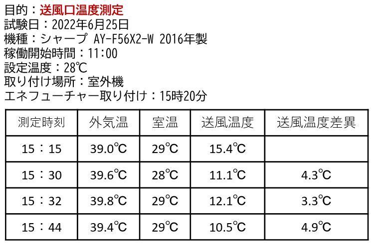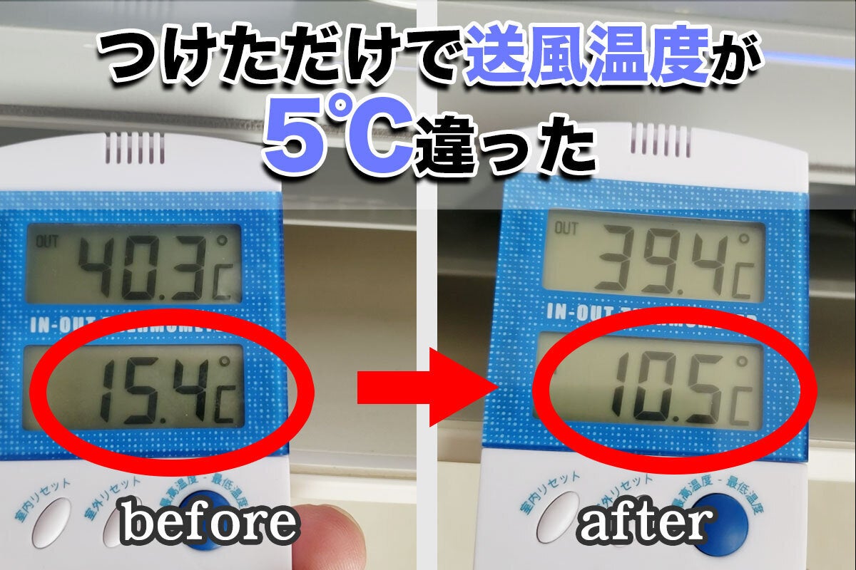 左がエネフューチャーをつける前で、右がエネフューチャーをつけたあとです、送風温度が5℃違いました。