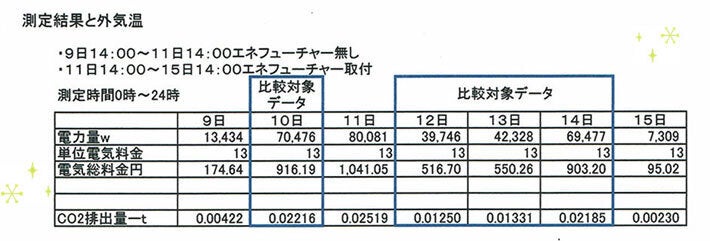 エネフューチャーをつけた後の3日間とつける前では1日の平均電力量が約2万w(28%)少なく、CO2も同じく28%削減しています。