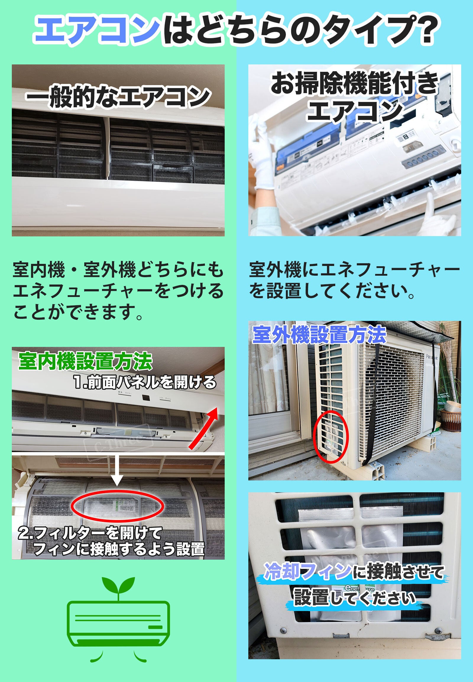 お掃除機能の付いていない一般的なエアコンの場合は室外機もしくは室内機のどちらかに設置してください。