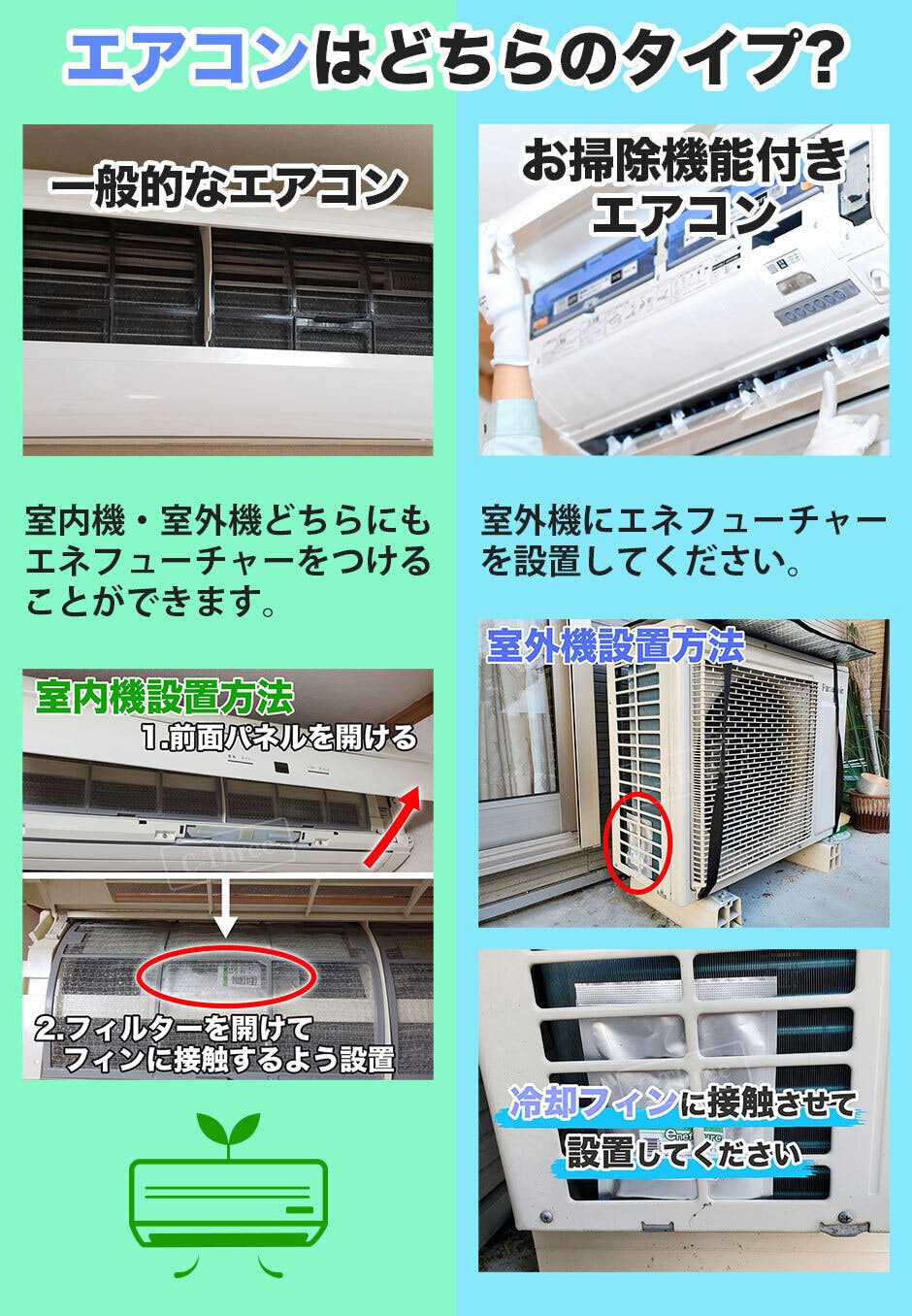 もし、お使いのエアコンがお掃除機能付きでしたら、室内機にはつけられないので、室外機につけてください。一般的なエアコンでしたら、室内機・室外機どちらにもエネフューチャーをつけることができます。フィンに接触させて設置すればよいので、簡単です。