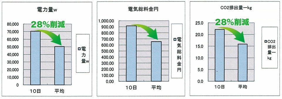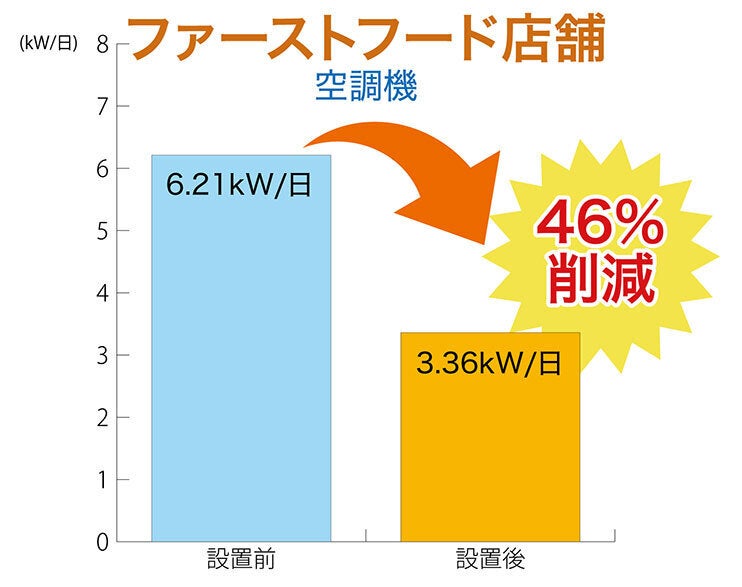 今回はファーストフードの空調機に対しソルベジェルとイオンブースターを設置した際の効果についてご紹介します。長文になりますが、是非読んでいただけたらと思います。以前「百貨店で業務用エネフューチャーをつけたら…」でも説明したとおり、ソルベジェルはエネフューチャーの業務用で、その導入実績を元に家庭用の「エネフューチャー」を開発しました。イオンブースターについては弊社サイトに掲載していますので、興味がありましたら下記URLよりご覧ください。・新しい省エネ方法のイオンブースター&ソルベジェルhttps://www.ionwave.jp/user_data/ionbooster1.php結果は上の画像のとおり、消費電力が46%減少しています。計測期間は、電力計測開始日から含めると1か月ほどです。実施期間電力計測開始日:2013年9月21日取り付け日:2013年10月3日計測終了日:2013年10月17日取付け前有効期間(現状把握):2013年9月22日~2013年10月3日午前取付け後有効期間(商品効果):2013年10月3日午後~2013年10月16日ソルベジェル&イオンブースター取り付け前後で、それぞれ解析対象日を選定し、1日あたりの平均消費電力量を比較しました。その結果、1日あたり消費電力量としては取り付け後では取り付け前に比べおよそ46%の減少が見られました。なお、取付けの前後期間で外気温の分布に大きな差はなく、温度の影響で消費電力差が生じたとは考えにくいです。解析対象日の考え方※可能な限り、同一の運転状況による電力消費差を評価するため、 以下2点の判断基準の下、使用条件が他と異なると見られる日を 解析対象から除外しました。 ①一日中空調の使用が見られなかった日(外気温が低すぎる等) ②運転状況が通常と明らかに異なっていた日①一日中空調の使用が見られなかった日について以下、赤丸で記した日については、対象機器の電力消費が見られず、解析対象から除外しました。電力消費が見られない理由としては ・外気温が低く、使用の必要性が無かった ・他の空調機を使用し、解析対象機器を停止していたなどが考えられます。 仮に解析に加えた場合は、停止日の日数によって平均値が大きく引き下げられる事となり、かたよった結果となる恐れがあります。②運転状況が通常と明らかに異なっていた日について以下に赤丸をつけた9月25日と10月12日は、気温が高い等の外的要因も無く、使用電流のレベルが一時的に通常の2.5倍近くにもなっています。現場の空調使用状況をヒアリングした結果から、他の空調機を止めるなどして負荷が厨房用空調機に集中したと考えられます。よって通常の運転状況ではない、人為的な操作による異常データと判断し、解析対象から除外しました。以上により、解析対象日を以下のように決定しました。詳細分析と考察①取付け前後の作業中停止率の変化についてソルベジェル&イオンブースター取付けによる消費電力量の削減は、吹出し温度の低下により、目的温度に早く到達するため、運転を停止または弱められる時間が長くなることによるものと考えられます。今回の取付け前後の停止率を比較したところ、下のように取付け後は5%の停止率増加が見られました。②取付け前後の電流値波形の変化について対象機器が冷風を出し始めてから、温度が安定するまでの代表的な電流値波形を見比べると、取付け前はサーモスタットが動作し、停止するまでだらだらと運転し続ける傾向があるのに対して、取付け後は、1回1回の連続運転時間が取付け前よりも総じて短めになる傾向がありました。このことから、冷却効率が向上していると推測されます。③取付け前後の電流分布の変化と統計的な差異について取付け前後の電流値を度数として下のように表しました。取付け前の電流値分布に対して、取付け後の電流値はより低い値を取っていることがわかります。また、統計的にも分布にあきらかな有意差があります。(99%以上の確率で違う分布を取っている)結論以上を総合すると、ソルベジェル&イオンブースター取付け後の消費電力量は明らかに削減しており、その要因となる停止率も上昇、電流値の使用分布も統計的に明らかに減少方向に変化しています。資料提供:株式会社イオン科学最後までお読みいただきありがとうございます。 いかがでしょうか、このソルベジェルの技術を使って家庭用に作られたのが、エネフューチャーです。参考になりましたら幸いです。ご支援どうぞよろしくお願いいたします。