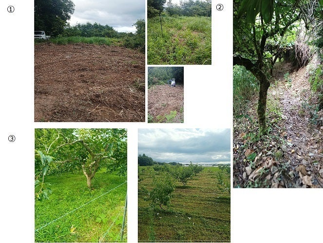 16日現況①の写真は、山頂の柿畑だった畑をバックホーで耕起の途中です。途中に雨が降り、深く掘り過ぎたこともあり、泥濘に嵌りキャタピラーが外れてしまいましたが、直して頂きました。細い竹や茎の堅そうな保水力が低そうな草が生えてます。教訓1 雨が降った後は作業しない。教訓2 作業前にキャタピラーにグリースを挿す(始業点検)②の写真は、柿の木が蔓などで覆われ土砂崩れと石が散乱、草が育ってない状態③の写真は、現役の柿畑と桃畑です。写真が小さくて見えずらいとは思いますが、現役の柿畑と桃畑は保水力が高そうな良い草が育ってます。これから梅雨があけると晴れた日が続きますので地表の乾燥と水分補給のために適度な草が必要です。SOFIX農業推進機構時代から相談に乗って頂いていた松田代表が、土壌の健康状態と対策案を研究いただけるとのことで、保水力が高い草が生える最適な圃場を目指す上で心強く思っております。HP https://soilcom.net/archives/2295Facebook https://www.facebook.com/soilcoms/(バックホー : 前回ユンボと書きましたがバックホーに訂正します)