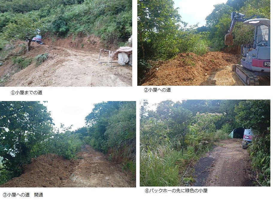 猛暑が続いております。(8月2日は最高気温38℃でした。)その影響でシャインマスカットの酸味が抜けず(甘くならない)お盆前後の出荷となるようです。工事の進捗ですが、バックホーの排土板のシリンダーから作業油が漏れ出し修理待ちの状況で、5段になっている圃場にバックホーで入れるように枝切りと法面の草刈と雑木切り(写真②、③)を行いながら、修理完了次第、先ずは左側の圃場入口に繋がっている公衆道路の土砂撤去作業(写真④)を行う予定です。