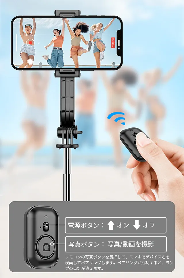 A:リモコンのシャッターボタンを長押ししてBluetooth機能をオンにし、スマホで対応名の「gimbal」を探してペアリングします。