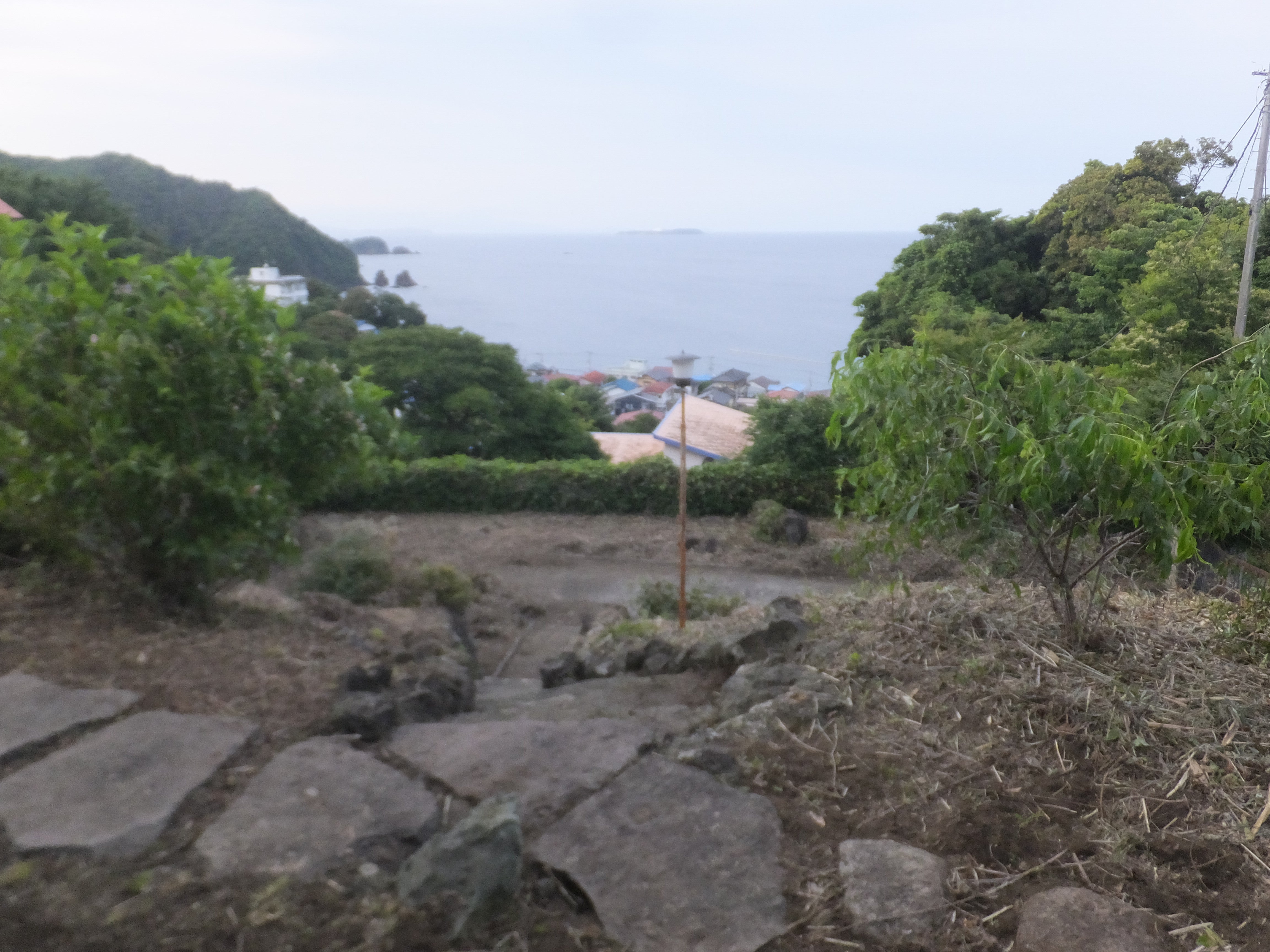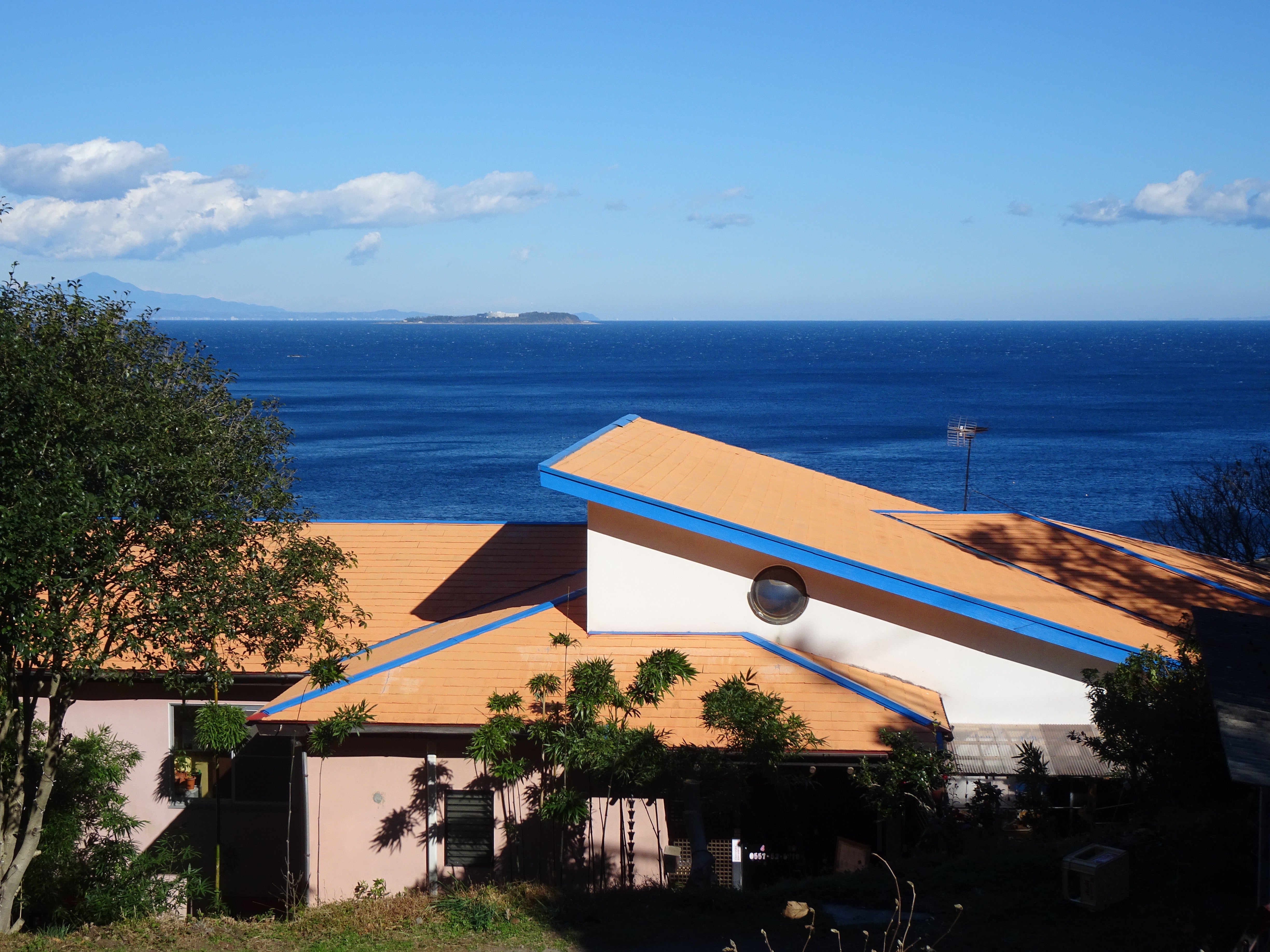 駿河湾が見える高台で奥には川奈アイランドのピンクの屋根が見えます。